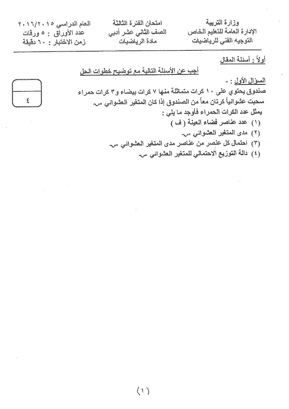 15. إحصاء, الفصل الأول, 2025-2026, نماذج اختبارت غير محلولة 1