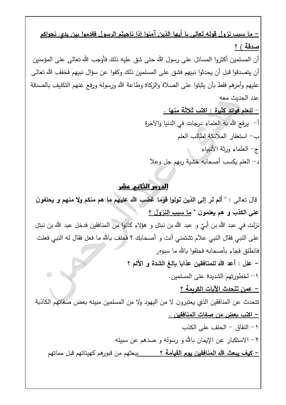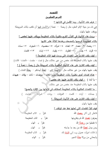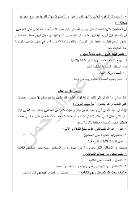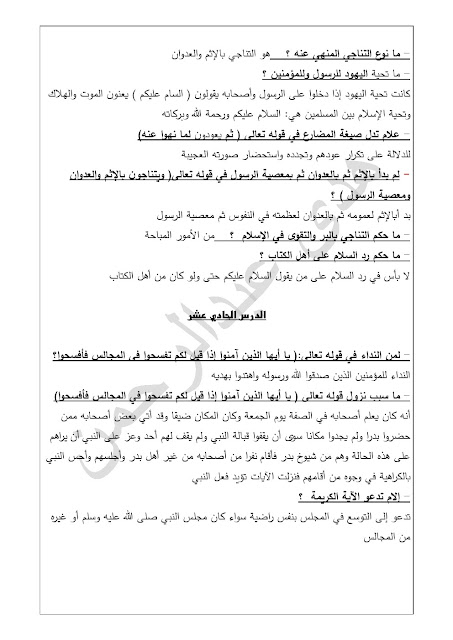 مذكرة في مادة التربية الاسلامية في 10 اوراق للصف الثاني عشر للفصل الدراسي الثاني تتضمنمذكرةشاملة للقرآن فاينل
