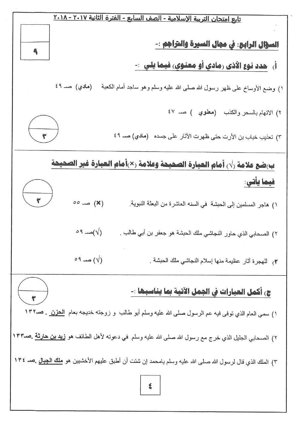 اليكم نموذج اجابة مادة التربية الاسلامية للصف السابع - الفترة الدراسية الثانية من العام الدراسي 2017-2018