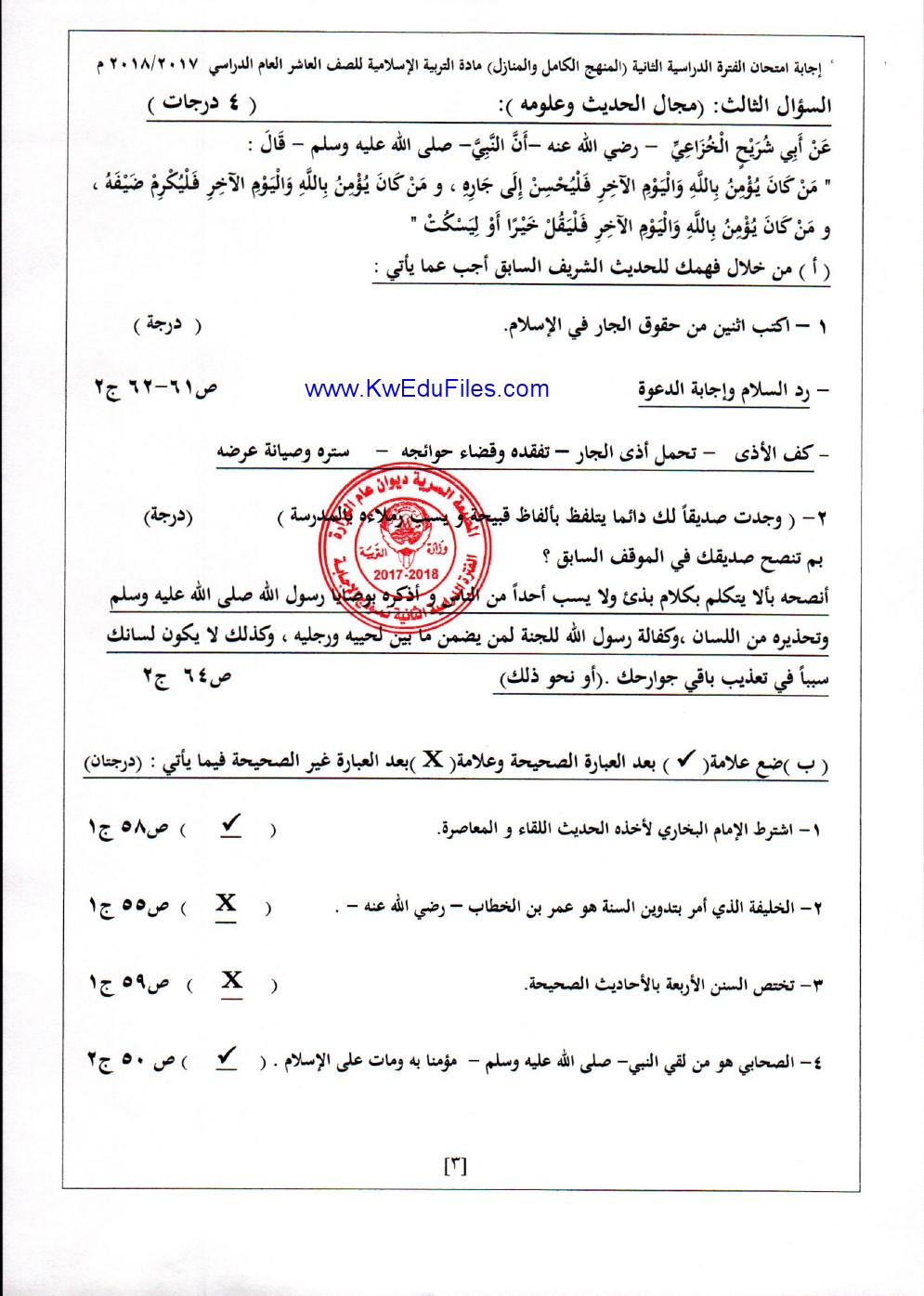 اجابة اسلامية عاشر الفترة الثانية 2018 منهج كامل ومنازل - إعداد: التوجيه الفني العام للتربية الاسلامية | ||