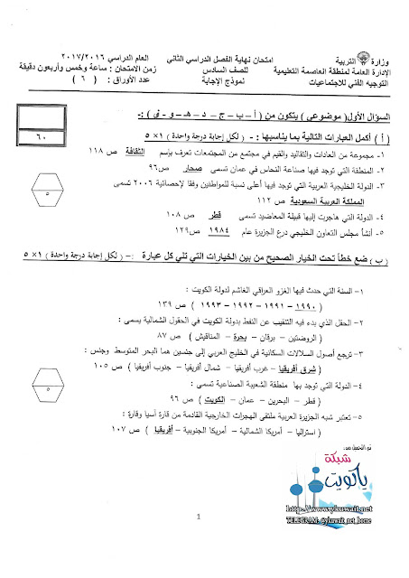 6. الصف الأول, اجتماعيات, نماذج اختبارات قصيرة
