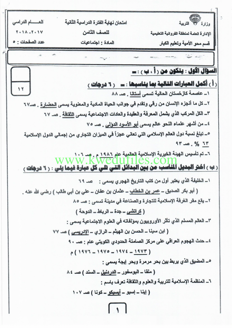 معلومات الملف: 6اوراق في مادة الاجتماعيات للصف الثامن للفصل الدراسي الثاني تتضمن نموذج اجابة اختبار تابع للادارة العامة لمنطقة الفروانية التعليمية | ||