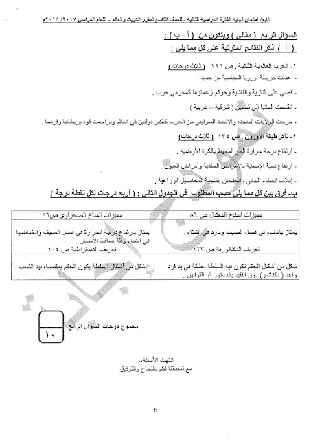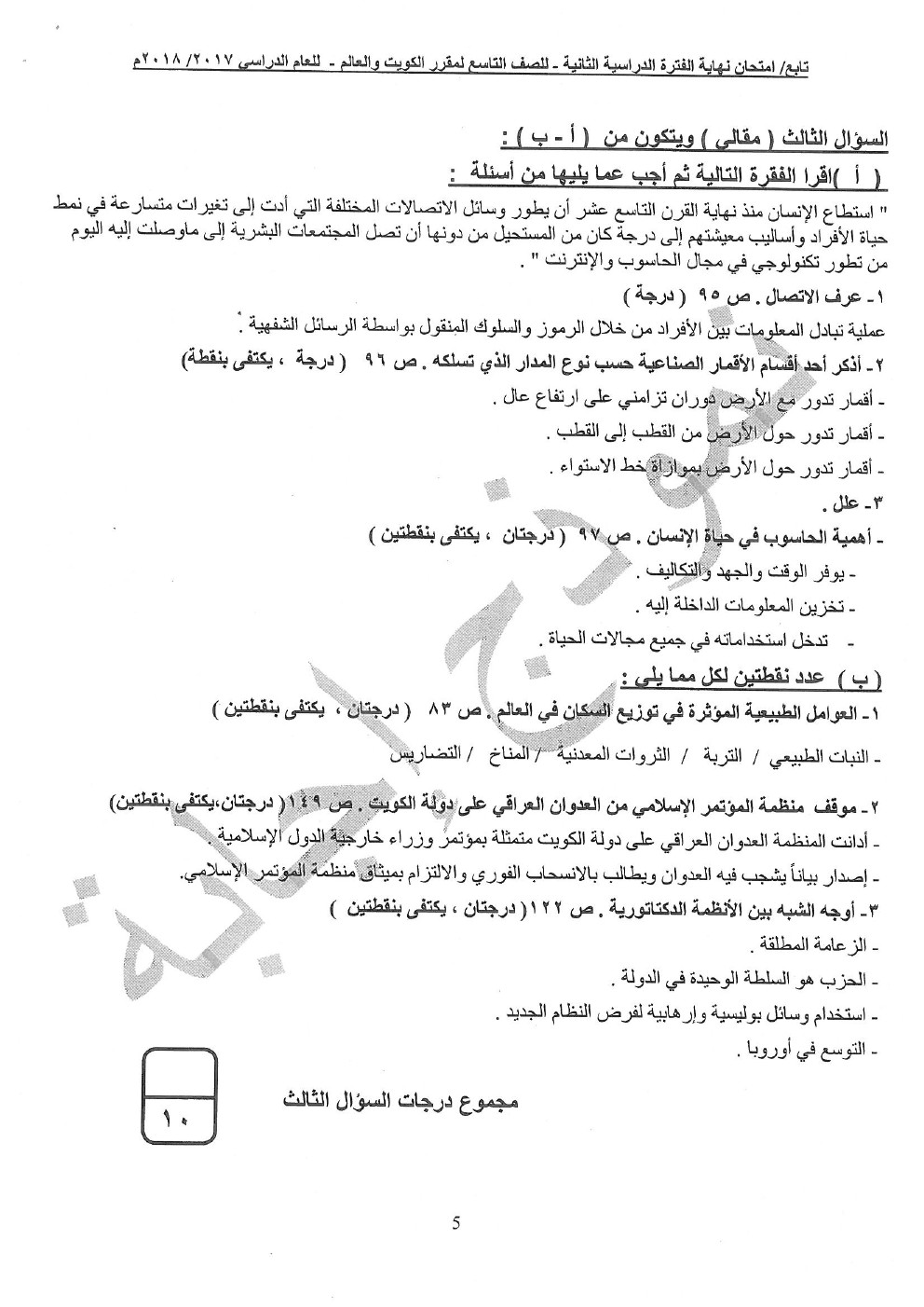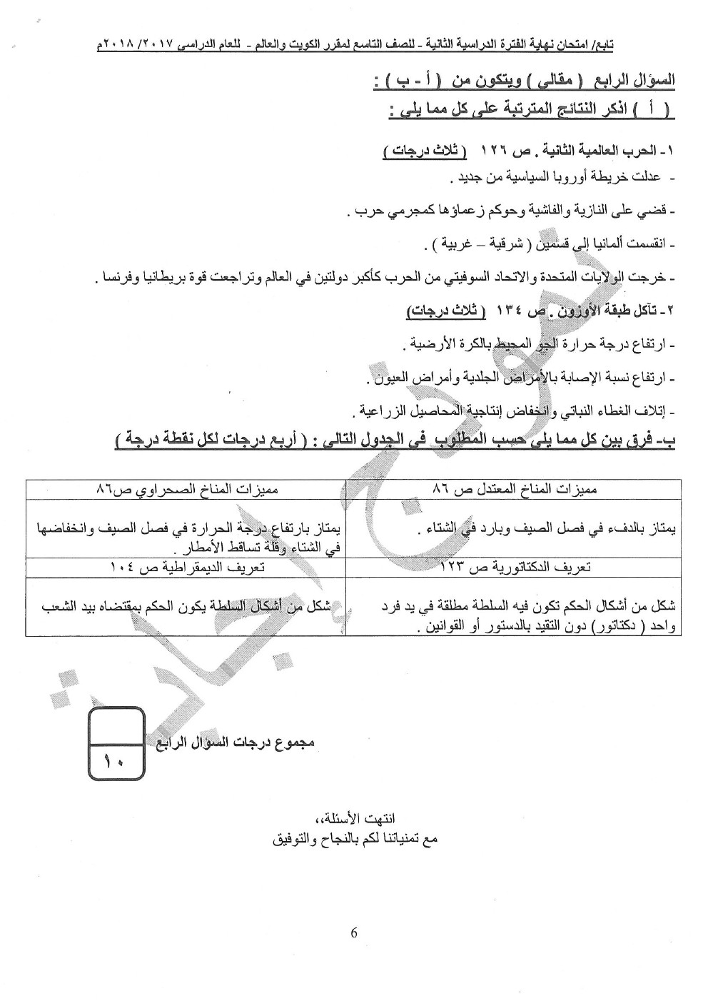 اليكم نموذج الاجابة في مادة الاجتماعيات للصف التاسع في منطقة العاصمة التعليمية وذلك للفترة الدراسية الثانية من العام الدراسي 2017-2018