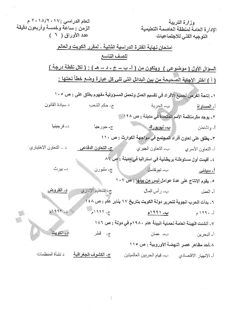 معلومات الملف: اليكم نموذج الاجابة في مادة الاجتماعيات للصف التاسع في منطقة العاصمة التعليمية وذلك للفترة الدراسية الثانية من العام الدراسي 2017-2018