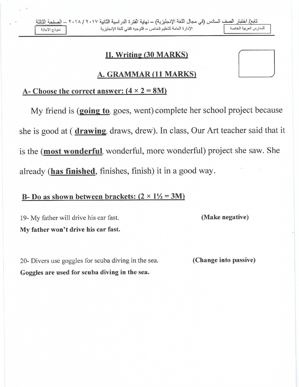 معلومات الملف: اجابة امتحان مادة اللغة الانجليزية للصف السادس - امتحان نهاية الفترة الدراسية الثانية من العام الدراسي 2017-2018 | ||