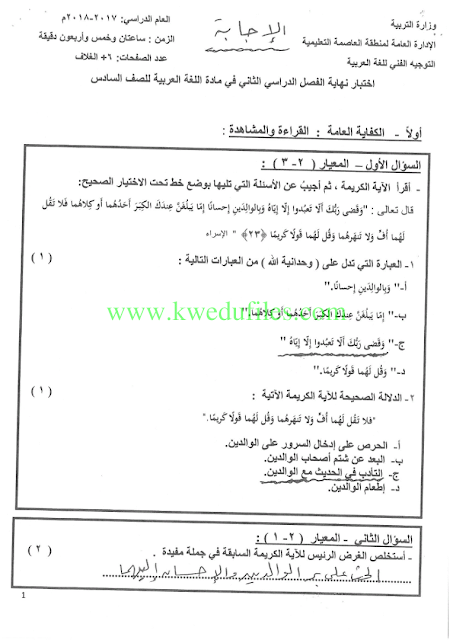 نموذج اجابة اختبار في مادة اللغة العربية لنهاية الفترة الدراسية الثانية لعام 2017_2018 - إعداد: منطقة العاصمة التعليمية