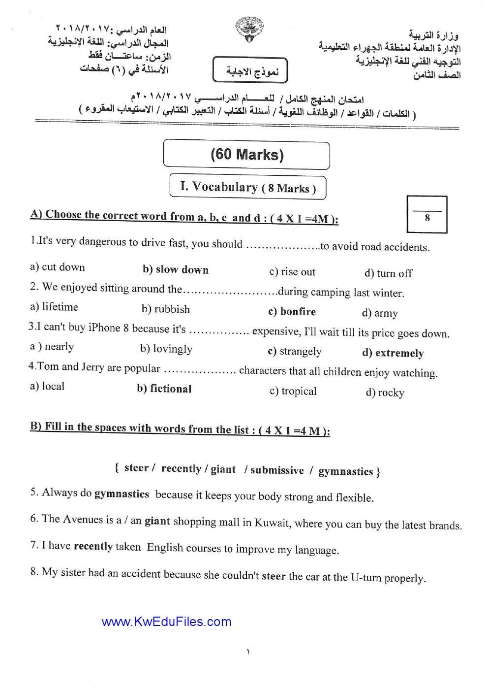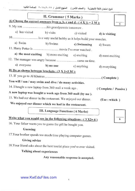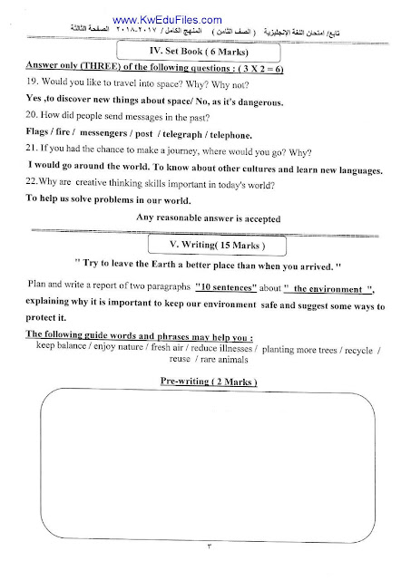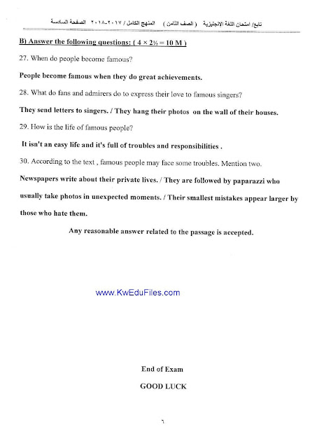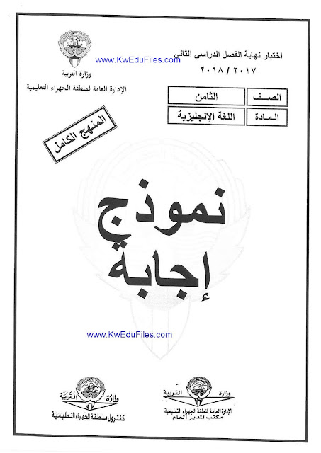 نموذج الاجابة لمادة اللغة الانجليزية للصف الثامن -منهج كامل- امتحان نهاية الفترة الدراسية الثانية من العام الدراسي 2017-2018