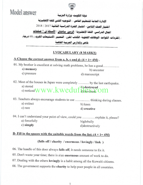 نموذج اجابة اختبار في مادة اللغة الانكليزية لنهاية الفترة الدراسية الثانية لعام 2017_2018 - إعداد: التعليم الخاص