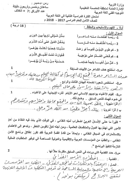 8 اوراق في مادة اللغة العربية للصف الثامن للفصل الدراسي الثاني تتضمن نموذج اجابة اختبار منطقة العاصمة لنهاية الفترة الدراسية الثانية من العام 2017_2018