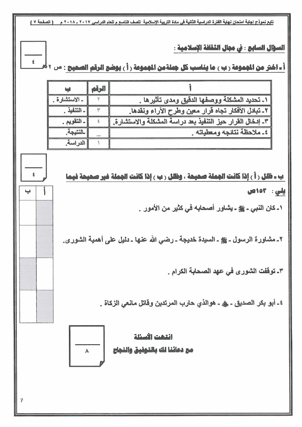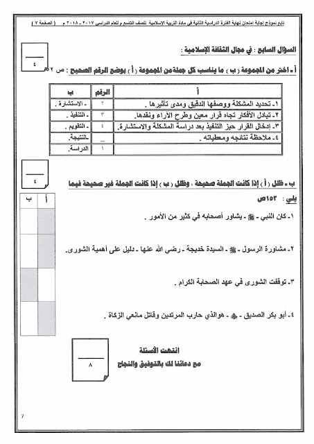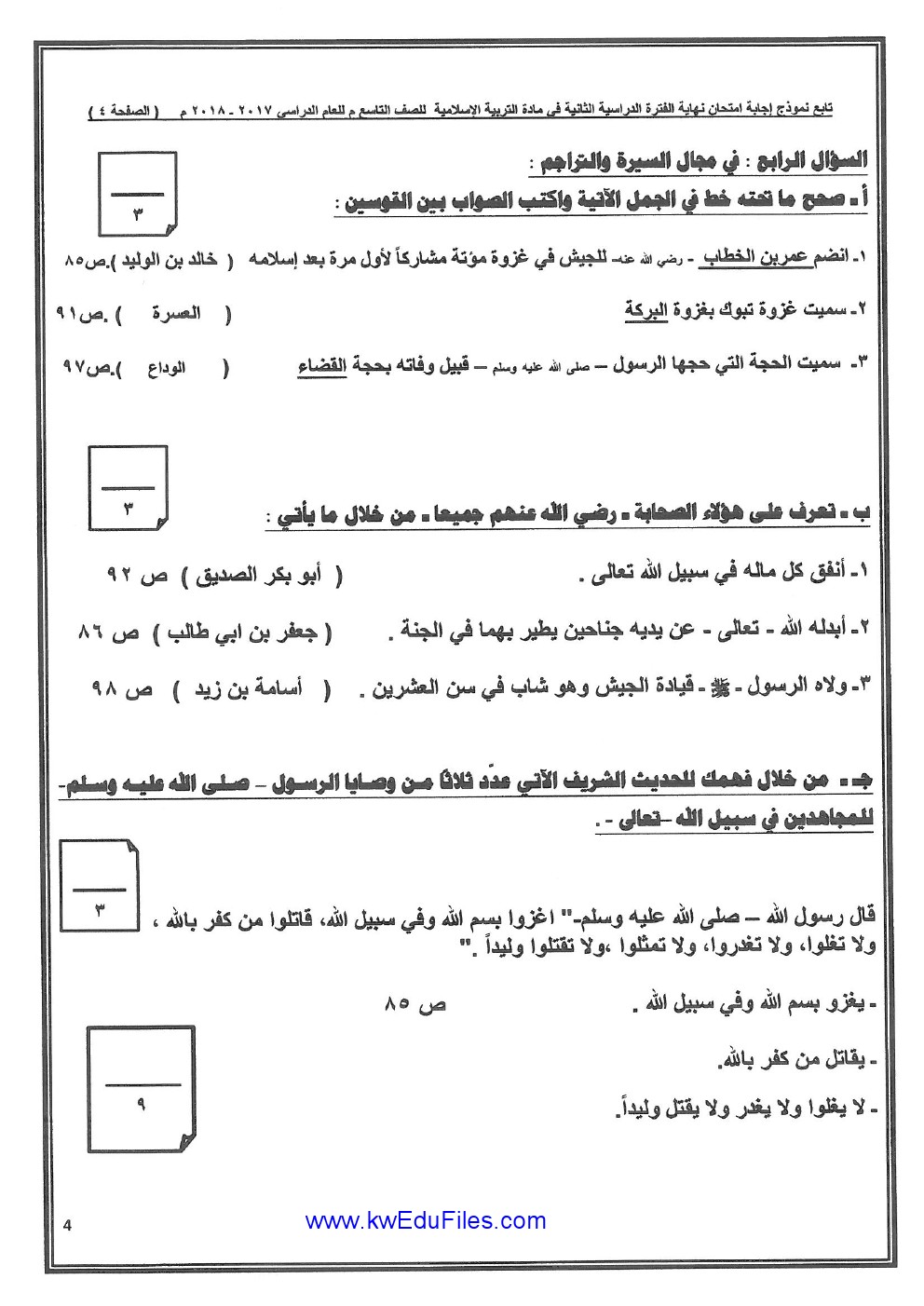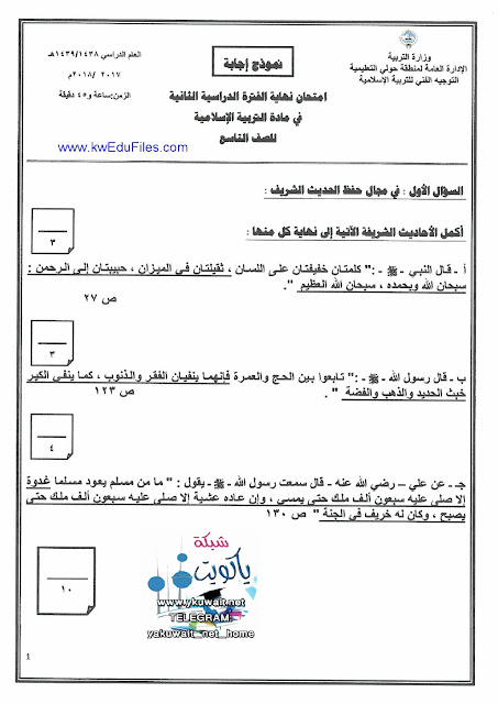 | اجابة تاسع اسلامية حولي 2018 - إعداد: منطقة حولي التعليمية | ||