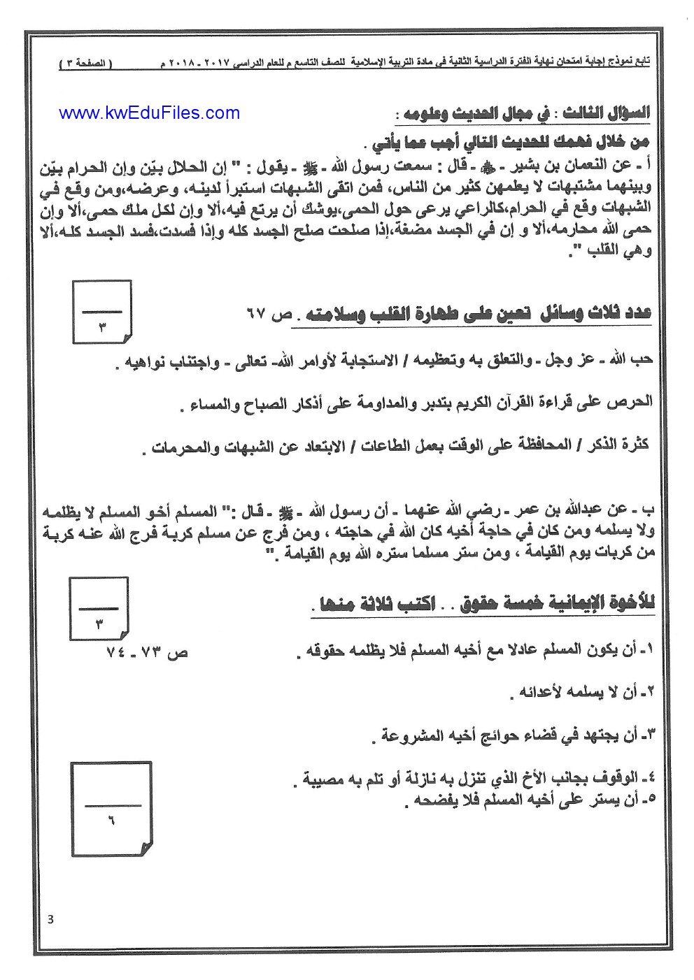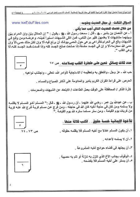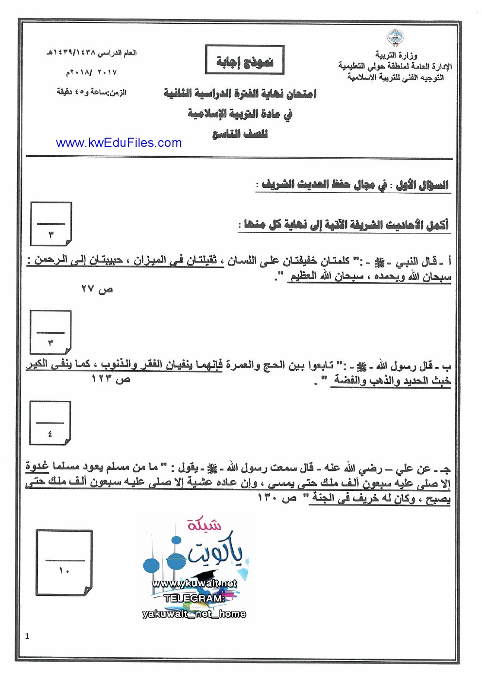 تم إيجاد الملف: اجابة تاسع اسلامية حولي 2018