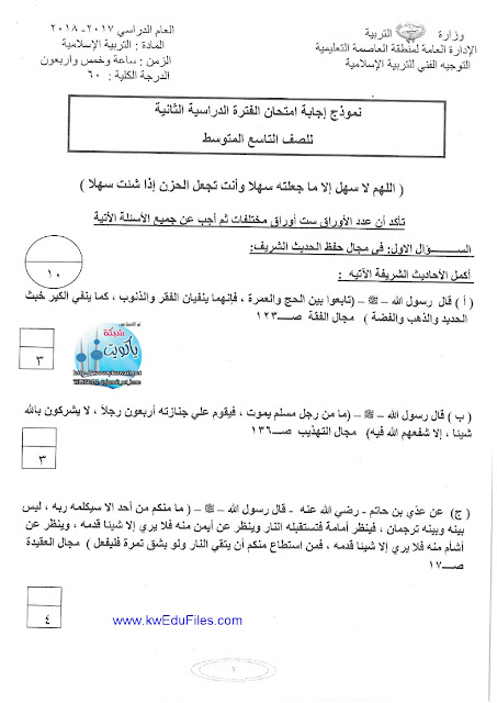 اجابة تاسع اسلامية العاصمة 2018 - إعداد: منطقة العاصمة التعليمية