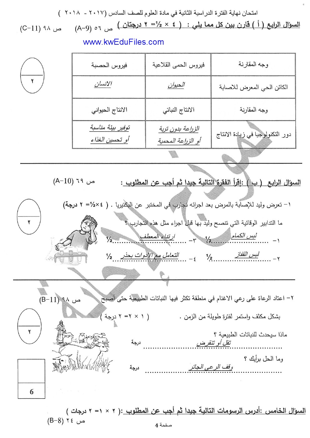 اجابة سادس علوم حولي 2018 - إعداد: منطقة حولي التعليمية