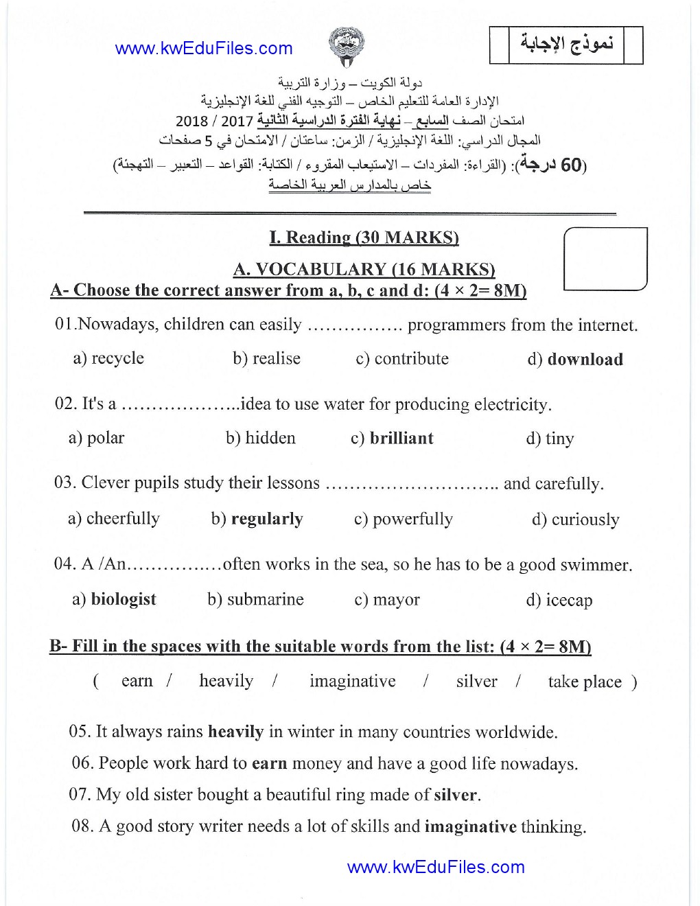تم إيجاد الملف: اجابة سابع انجليزي خاص 2018