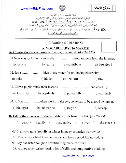 اجابة سابع انجليزي خاص 2018 - إعداد: التعليم الخاص