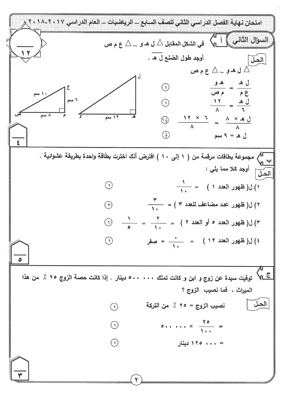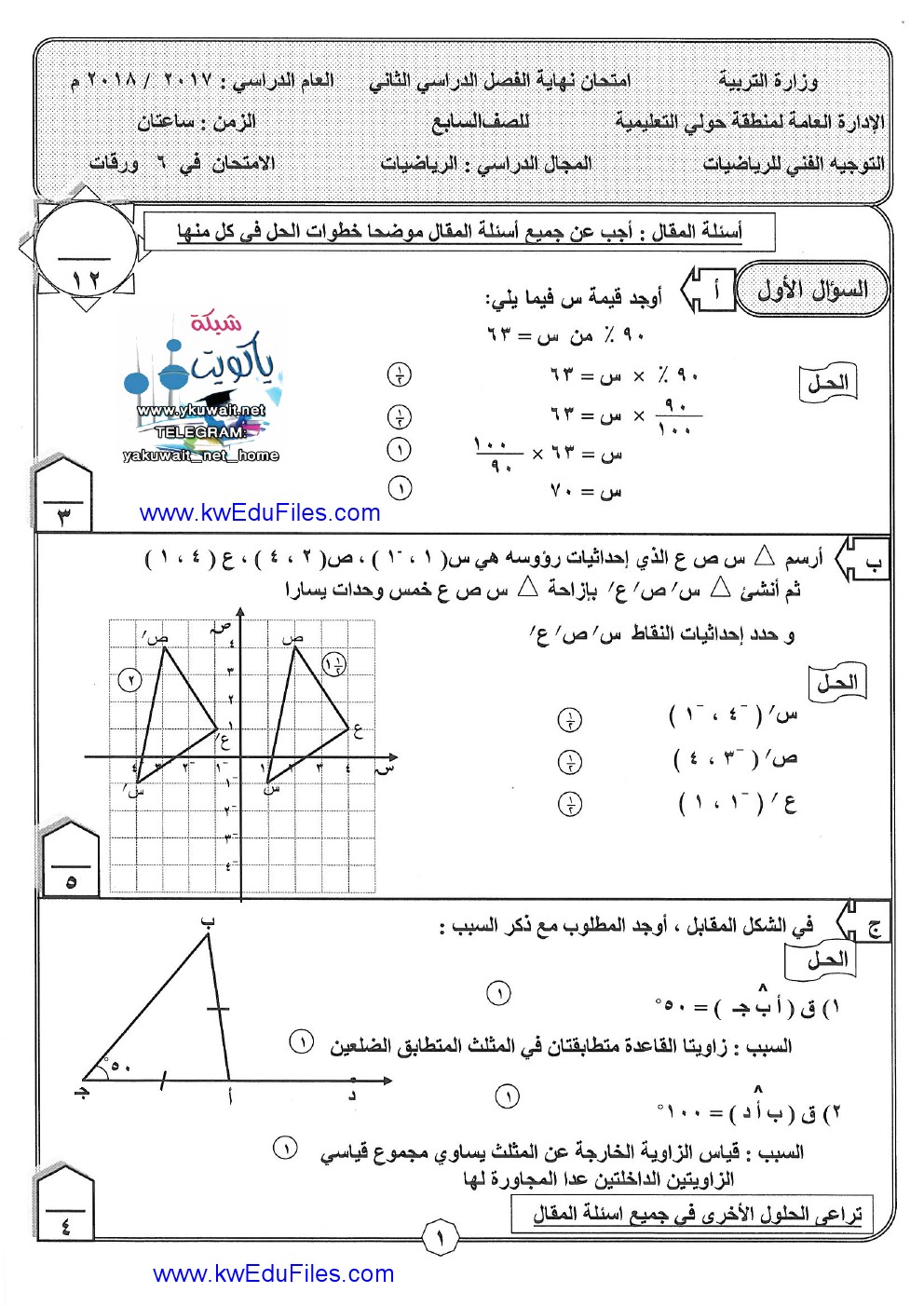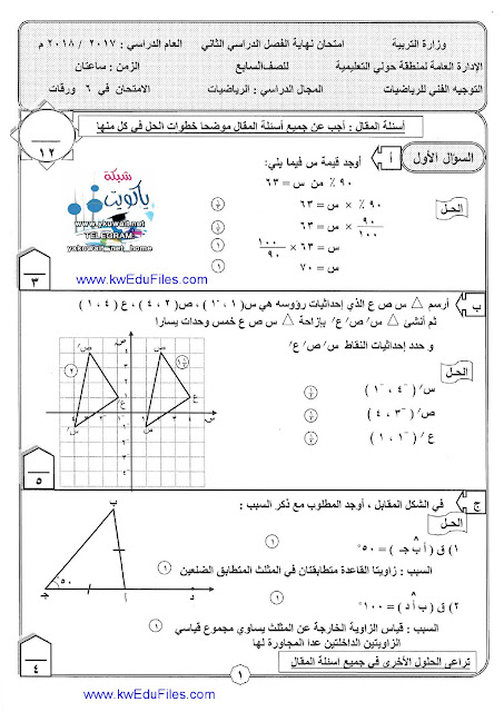 اجابة سابع رياضيات حولي 2018 - إعداد: منطقة حولي التعليمية