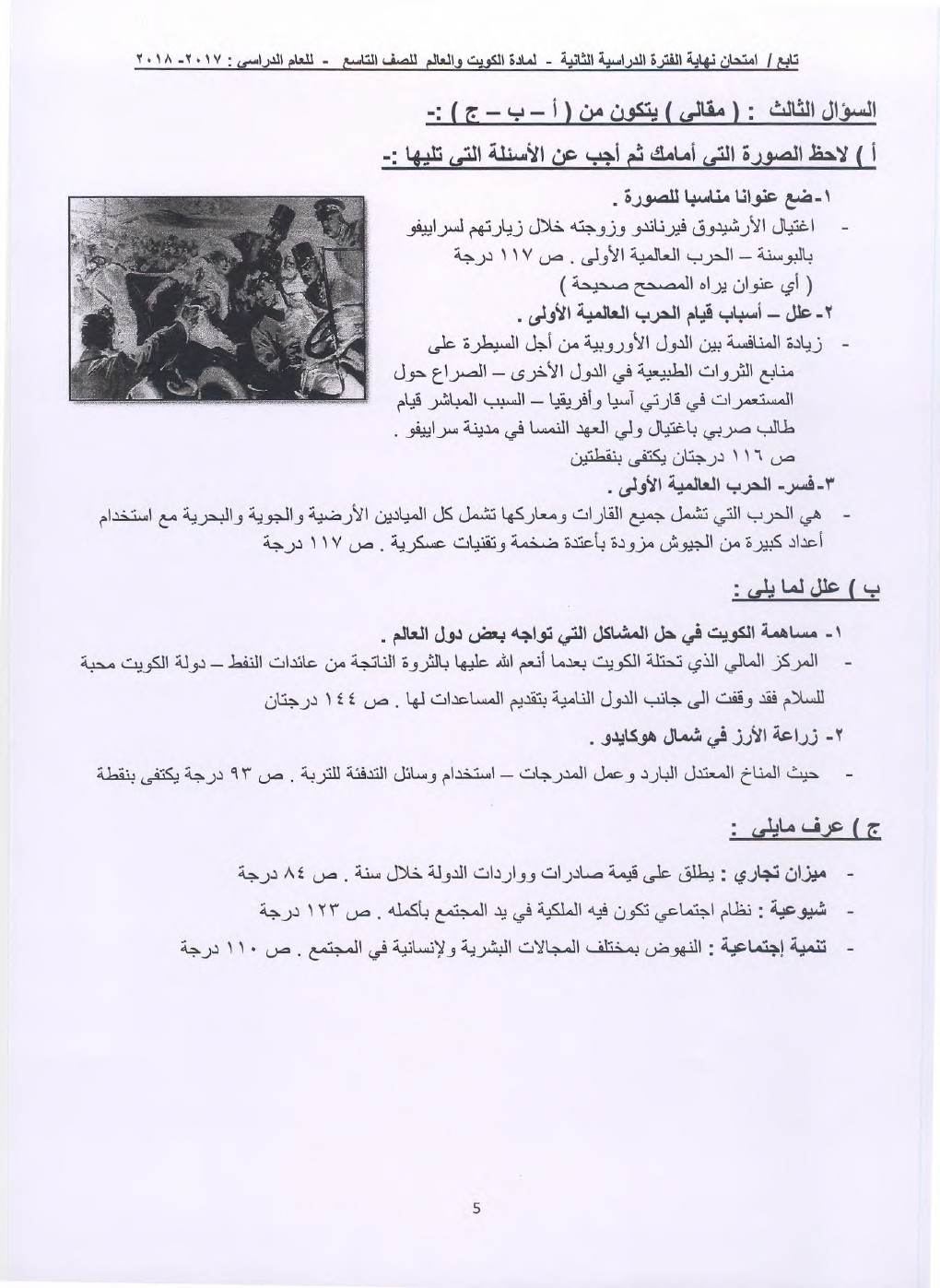 نموذج اجابة امتحان نهاية الفترة الدراسية الثانية من العام الدراسي 2017-2018 في مادة الاجتماعيات في منطقة مبارك الكبير التعليمية