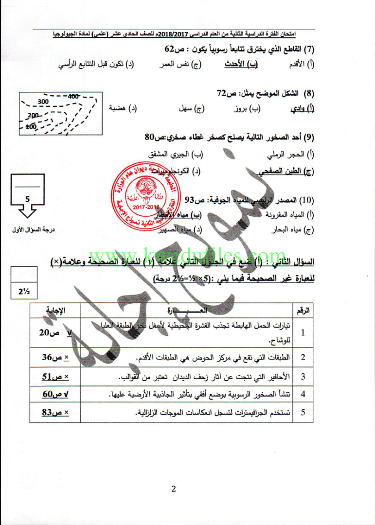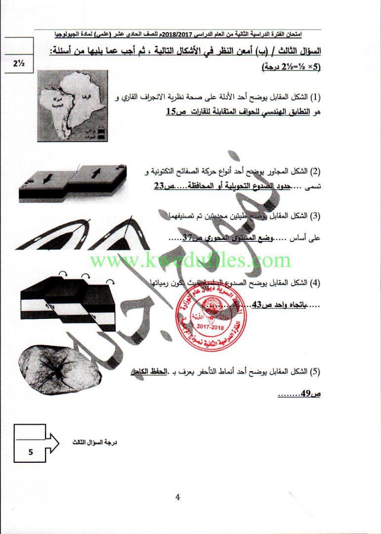 اجابة نموذجية للفترة الثانية في مادة الجيولوجيا2018