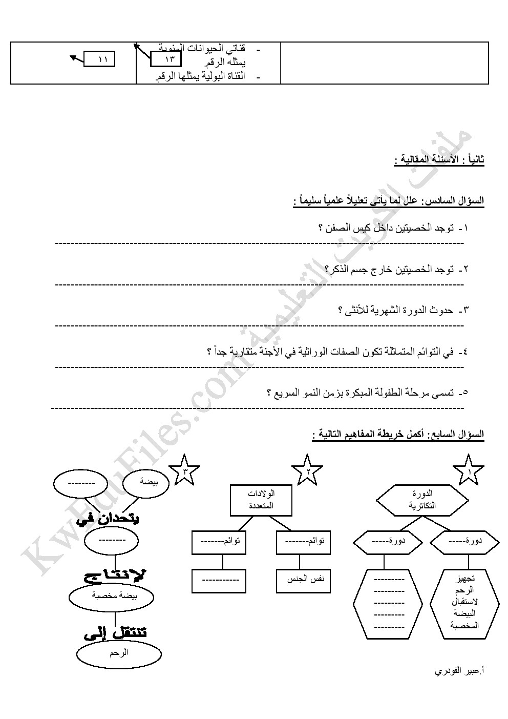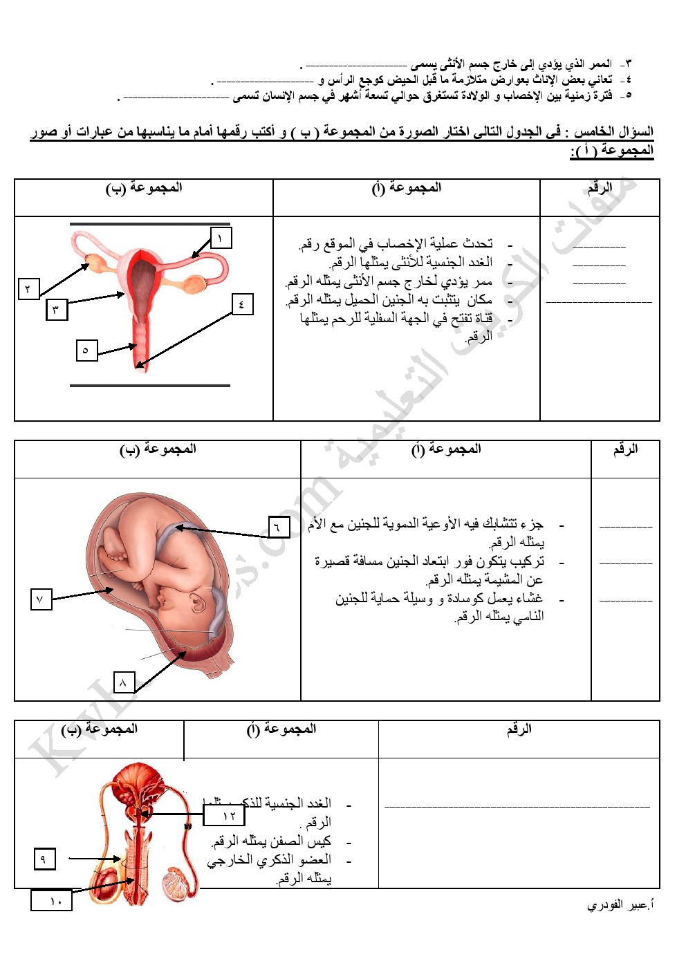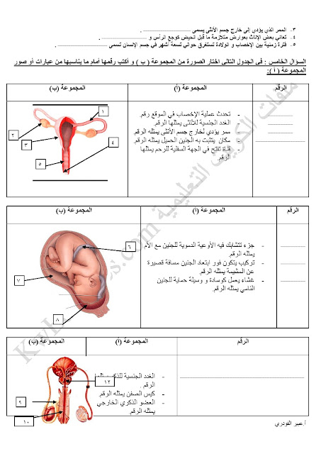 بنك الأسئلة لمادة العلوم للصف التاسع- - الوحدة الاولى: حياة الانسان - الفصل الأول: التكائر في الانسان