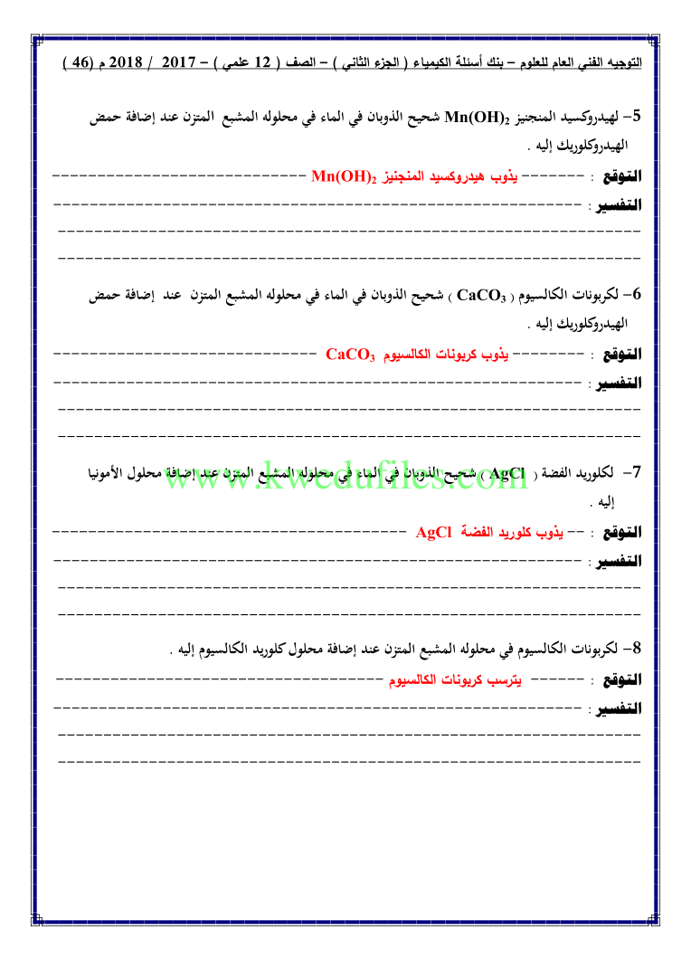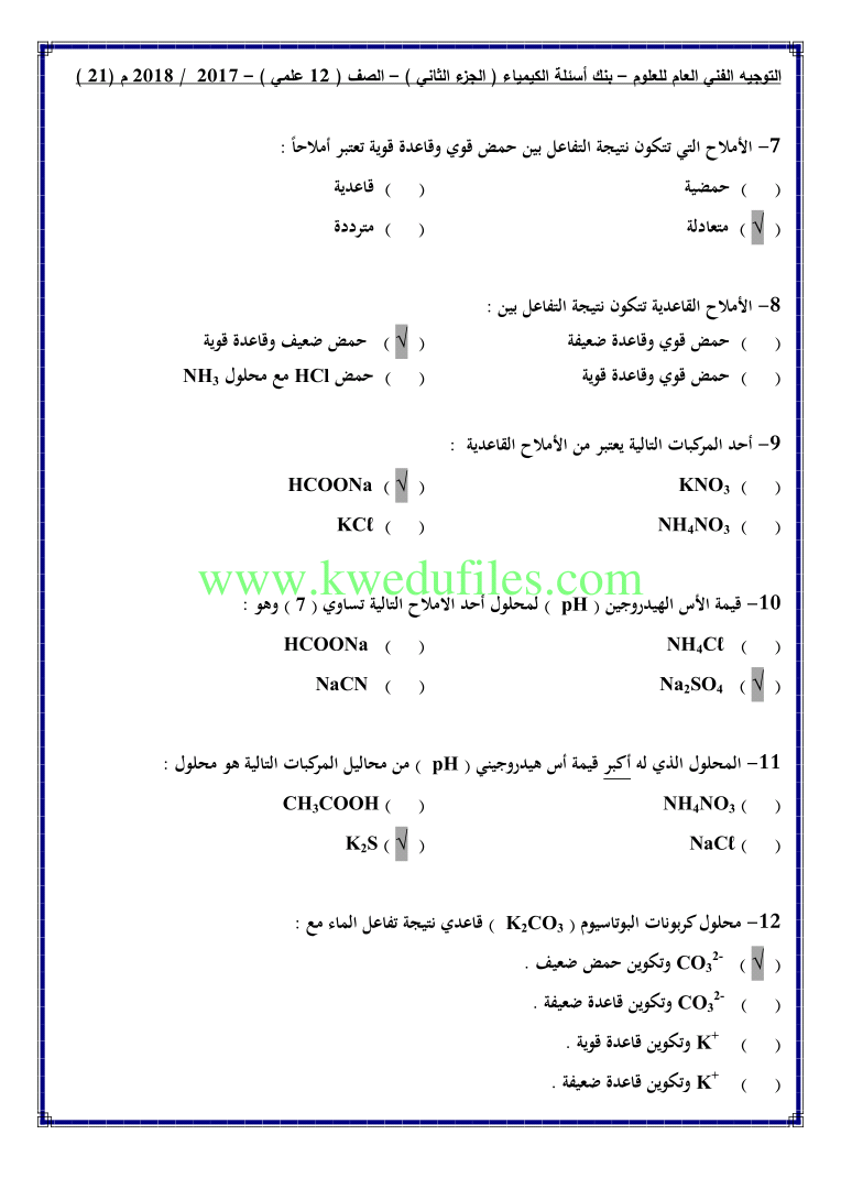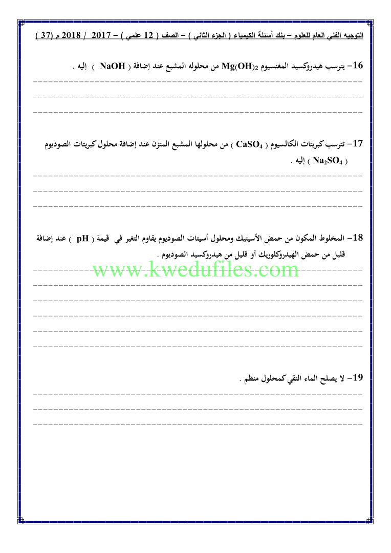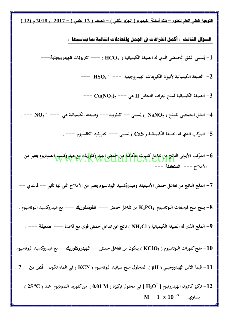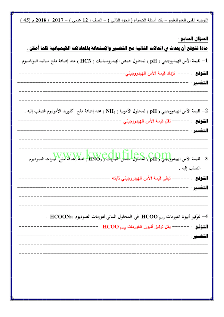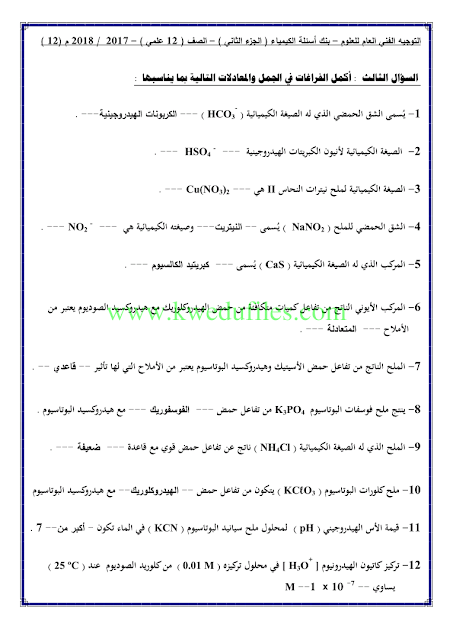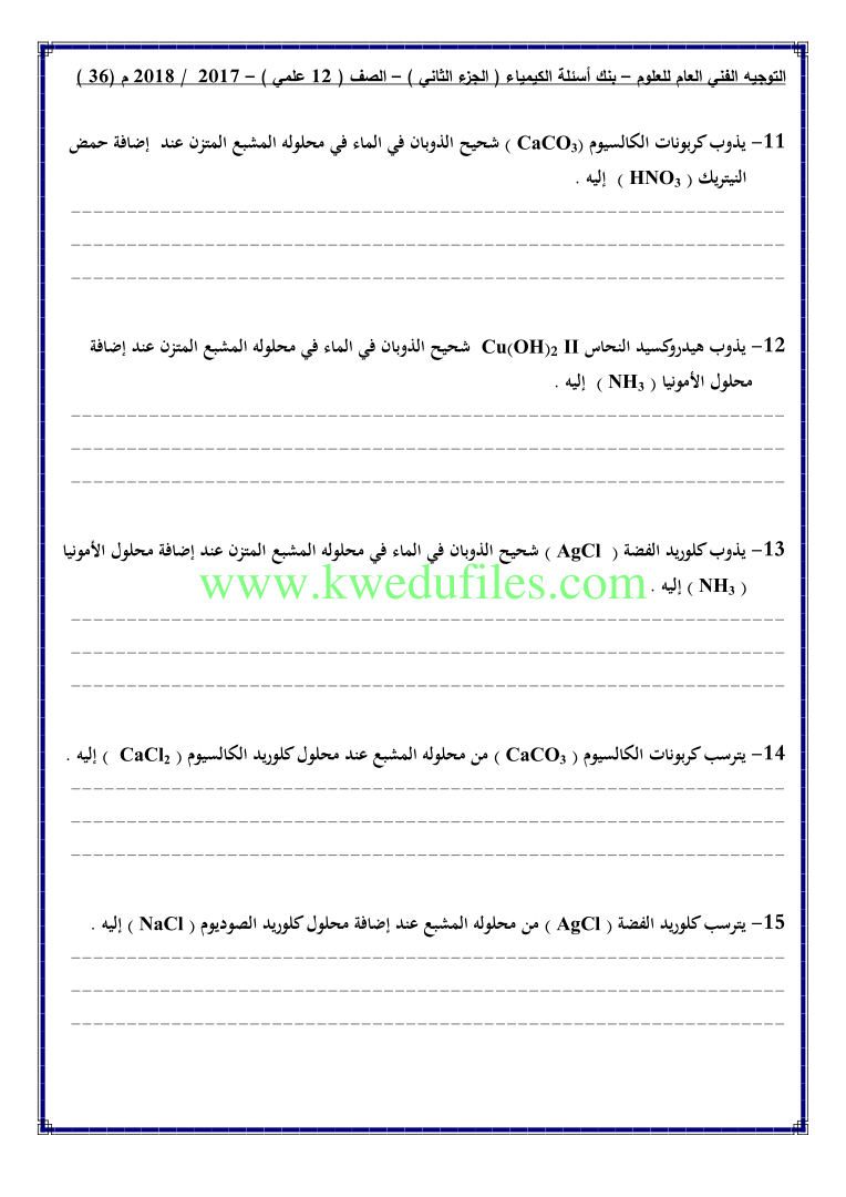 12. كيمياء, الفصل الثاني, 2024-2025, توقعات نهائية للاختبار القصير الثاني (أسئلة)