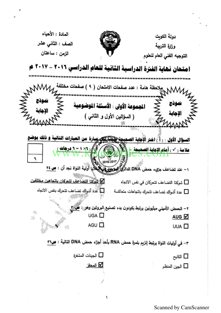 | امتحان نهاية الفترة الدراسية الثانية في مادة الاحياء - إعداد: التوجيه الفني العام للعلوم | ||