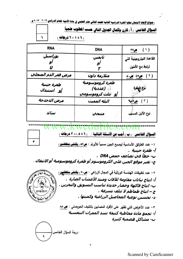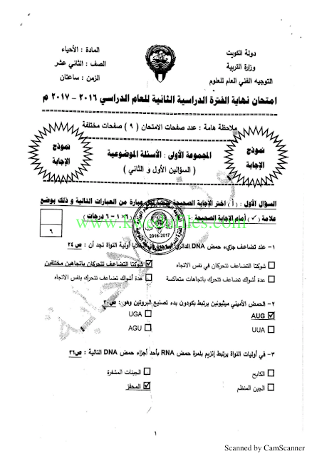 امتحان نهاية الفترة الدراسية الثانية في مادة الاحياء, التوجيه الفني العام للعلوم, الصف الثاني عشر العلمي, علوم, الفصل الثاني, 2017-2018 - المناهج الكويتية
