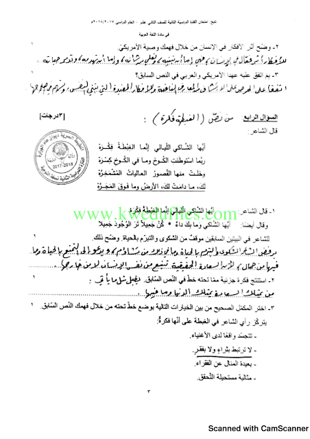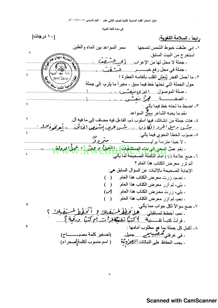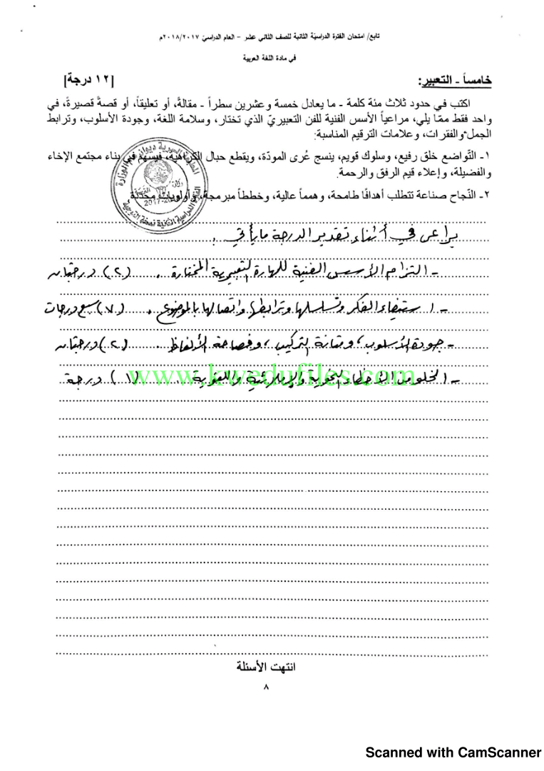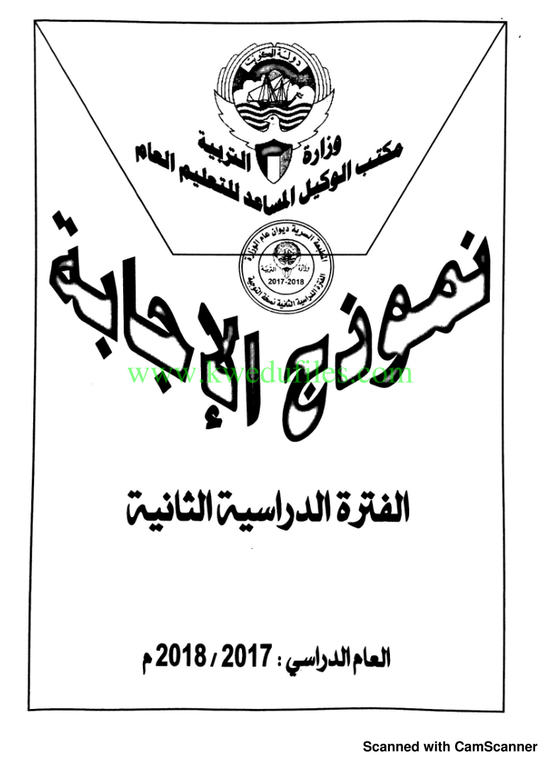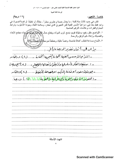 نموذج اجابة اختبار في مادة اللغة العربية لنهاية الفترة الدراسية الثانية لعام 2017_2018
