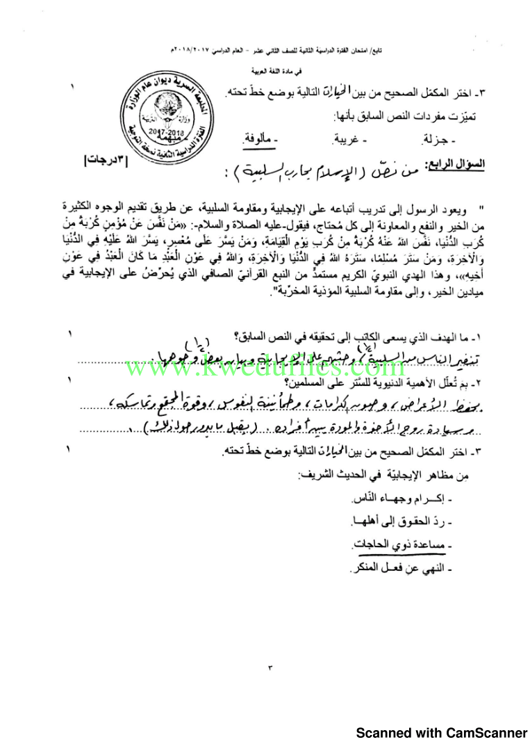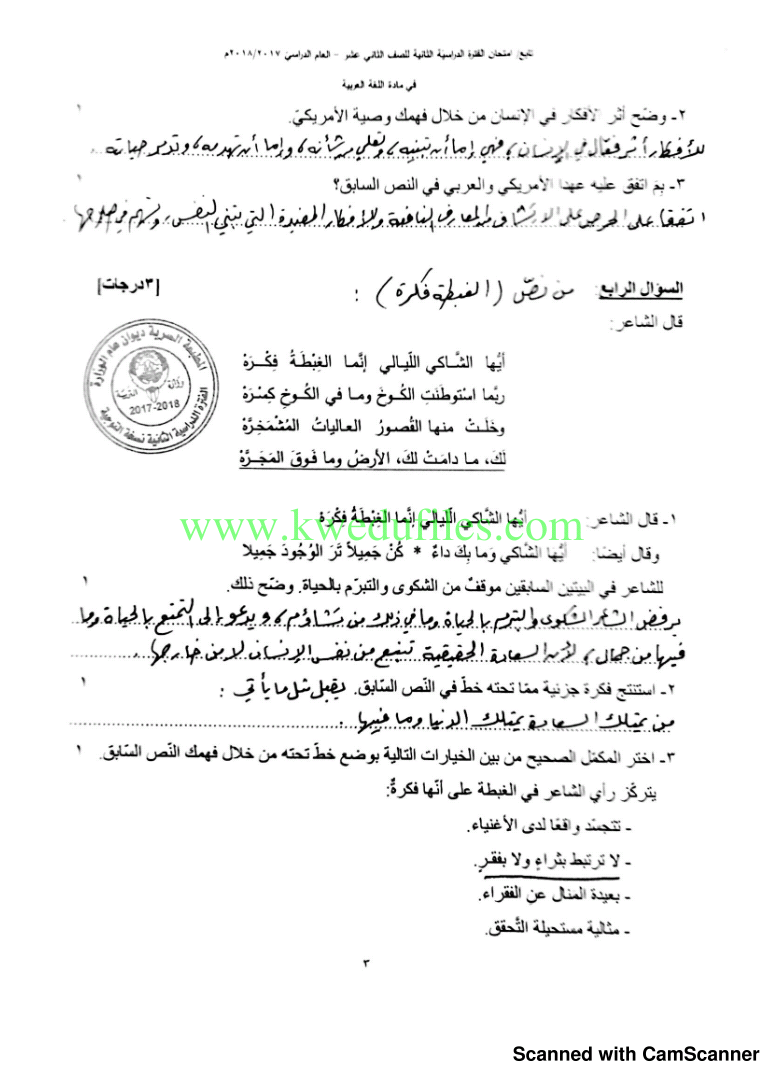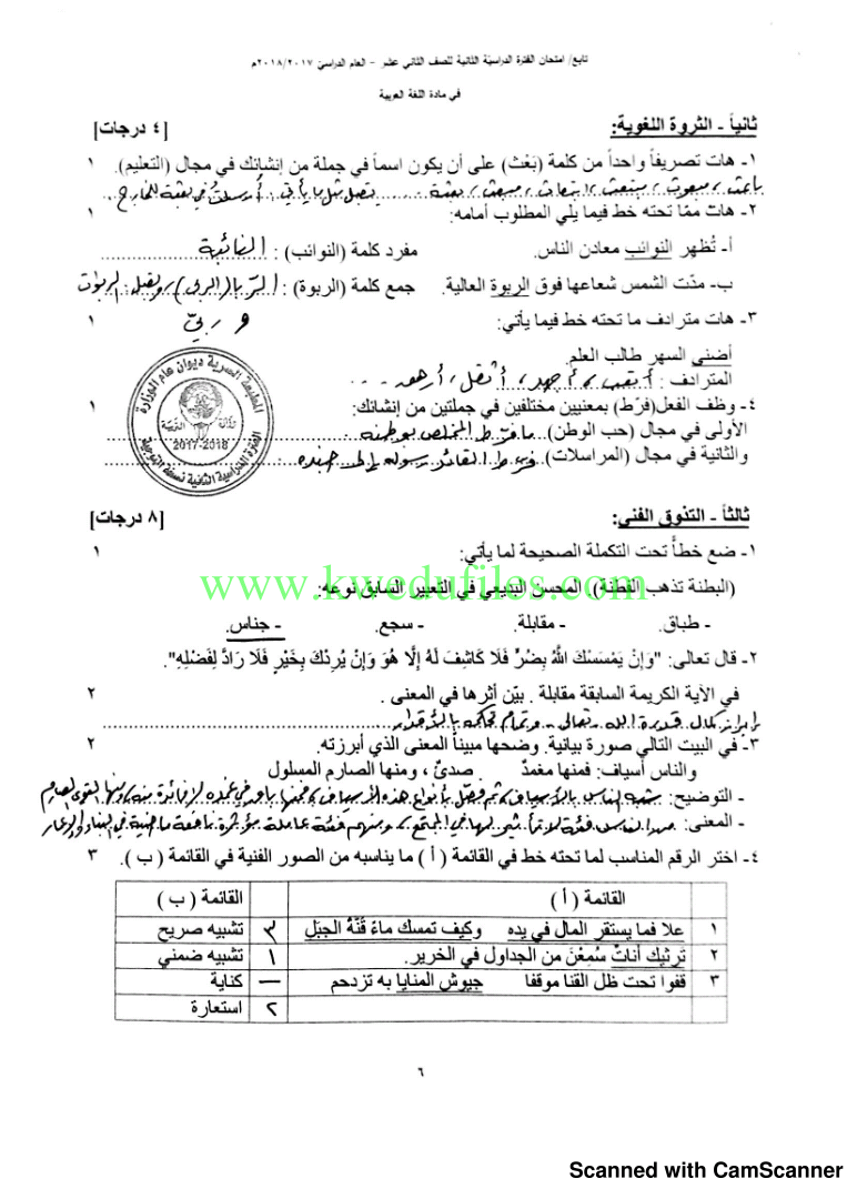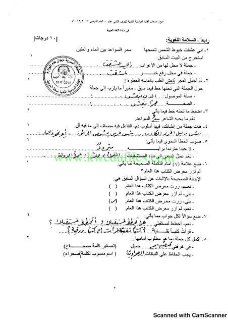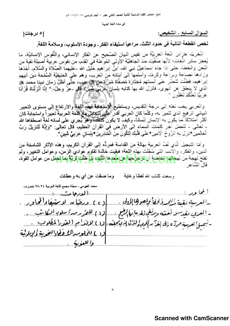 نموذج اجابة اختبار في مادة اللغة العربية لنهاية الفترة الدراسية الثانية لعام 2017_2018