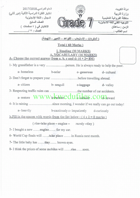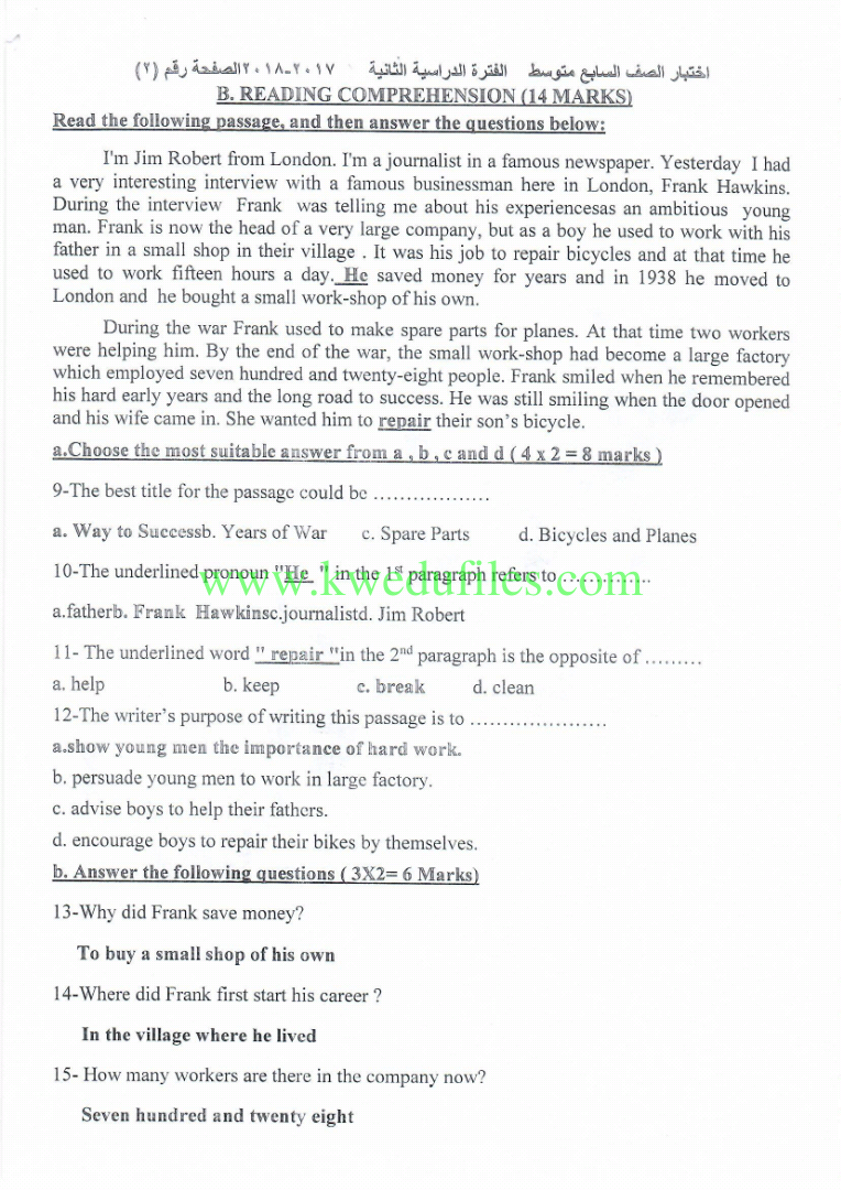 | نموذج اجابة اختبار الدور الثاني لمنطقة الفروانية التعليمية في مادة اللغة الانكليزية | ||