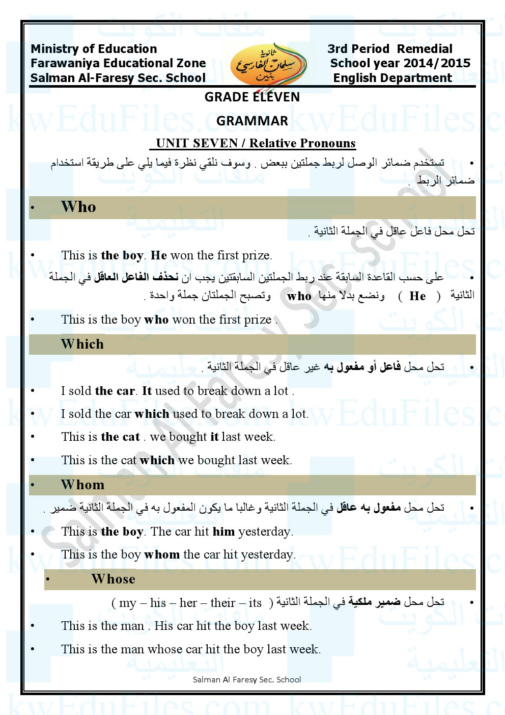 معلومات الملف: يتضمن هذا الملف كامل قواعد الفترة الثالثة في اللغة الانكليزية GRADE ELEVENGRAMMARUNIT SEVEN / Relative Pronouns Ministry of Education 3rd Period Remedial | ||