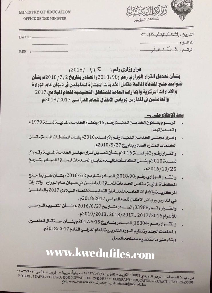 نشرت وزارة التربية قرار بتعديل تاريخ استحقاق مكافأة الاعمال الممتازة للعاملين في المدارس ورياض الاطفال للمعينين قبل تاريخ2016/18/9عدد اوراق هذا الملف ورقتين | ||