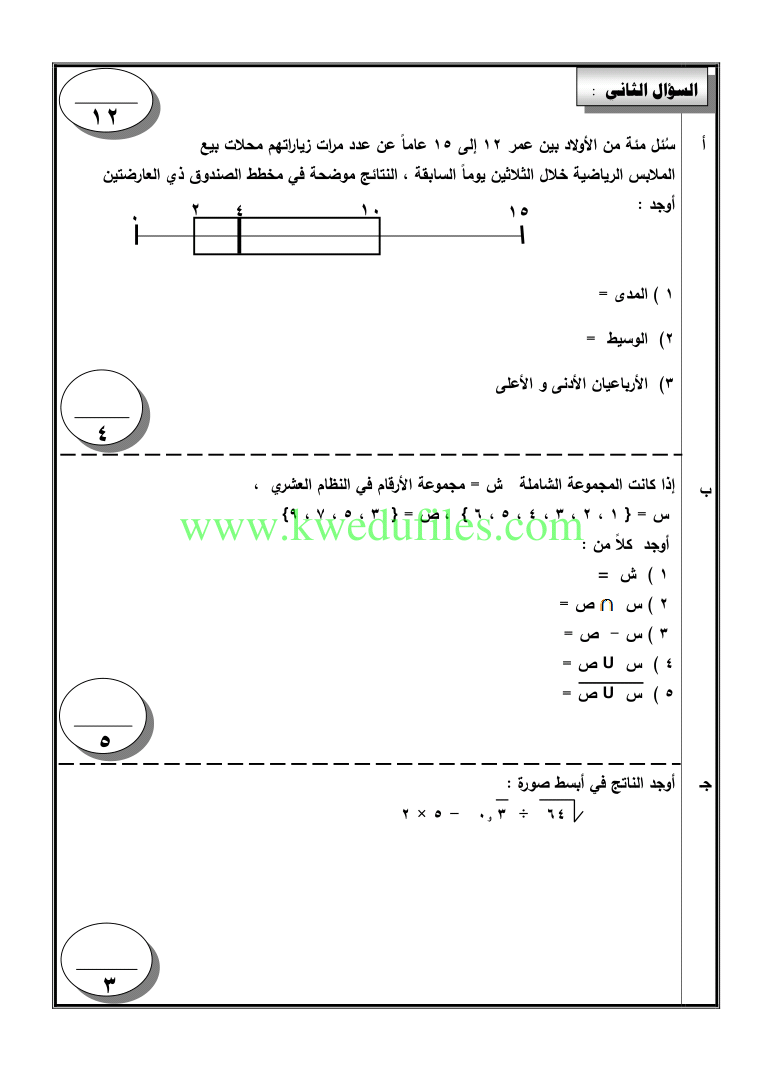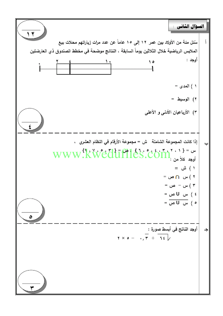 12. رياضيات, الفصل الأول, 2025-2026, نماذج اختبارات تقويمية