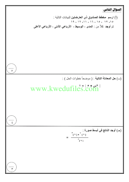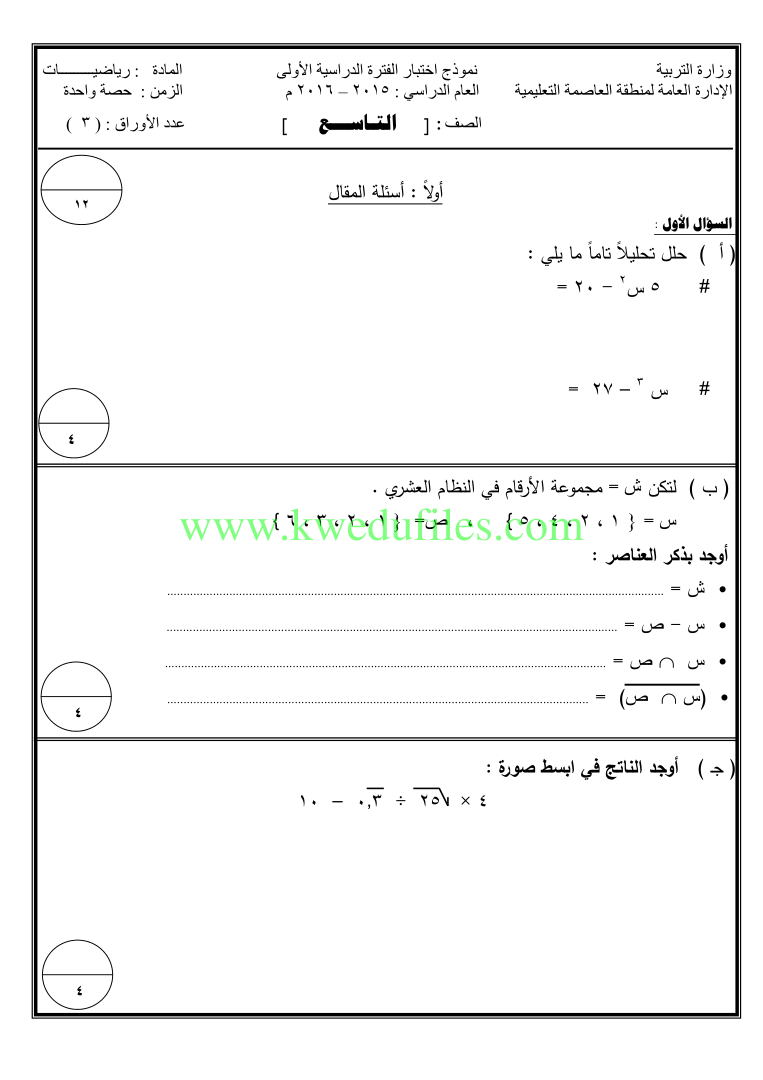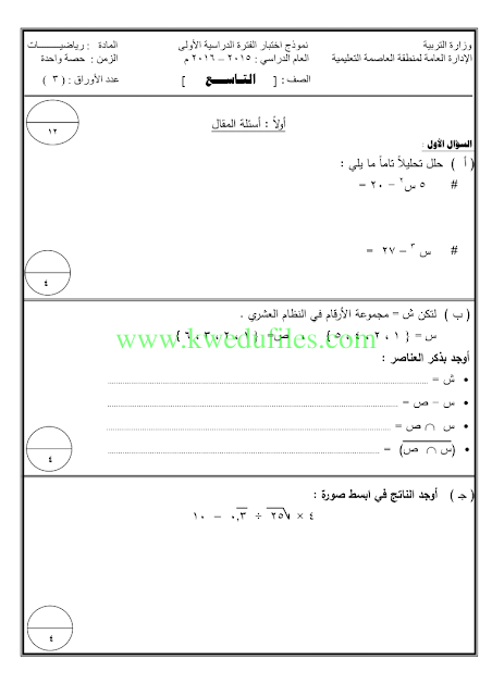 أنت هنا: موقع المناهجالمناهج الكويتية الصف التاسع رياضيات الفصل الأول الامتحان النهائي