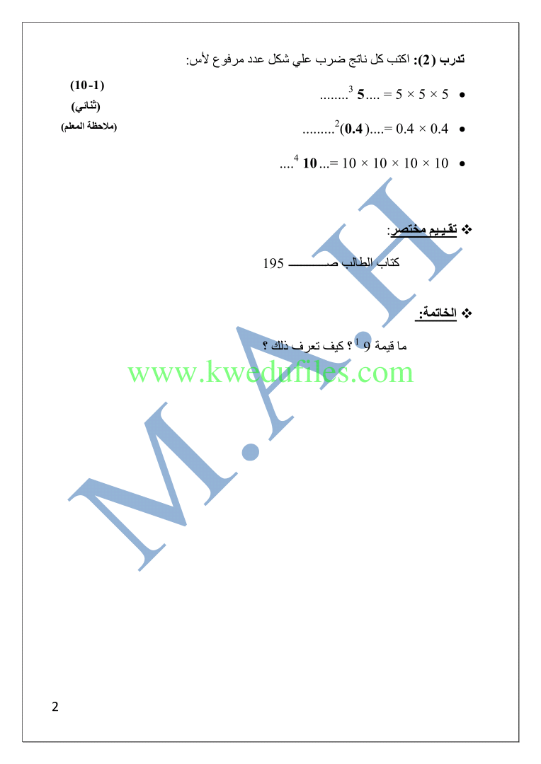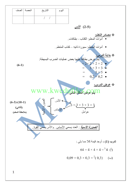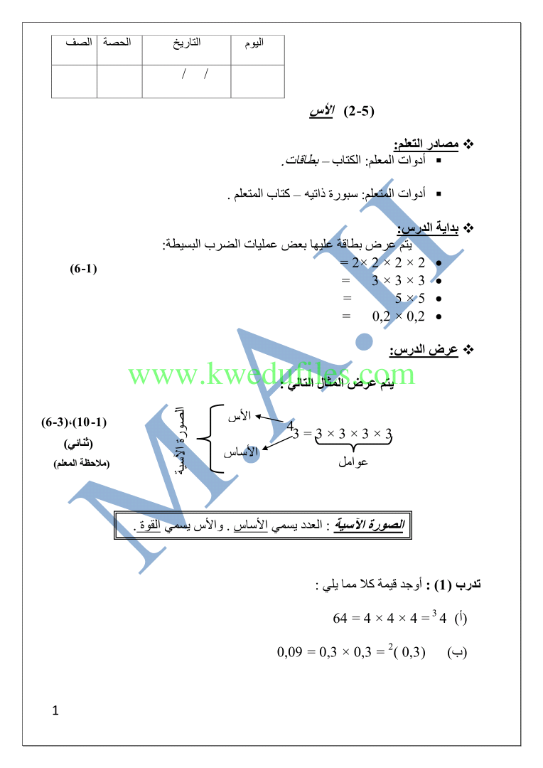 بند 2_5درس الأس في مادة الرياضيات للصف السادس للكورس الاول عدد اوراق هذا الملف ورقتين