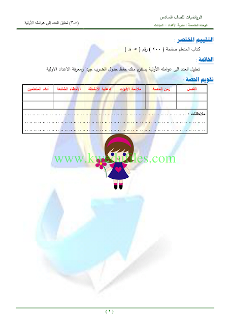 معلومات الملف: تحليل العدد الى عوامله الاولية في مادة الرياضيات للصف السادس للكورس الاول عدد اوراق هذا الملف ورقتين | ||