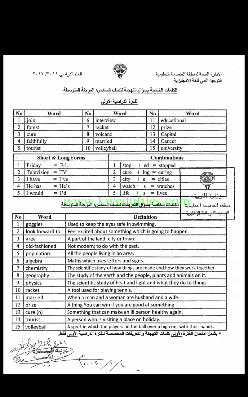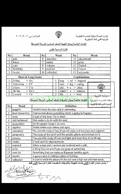 كلمات الاملاء والاختصارات المطلوب لمادة اللغة الانجليزية الواجب حفظها ودراستها للفترة الاولى - إعداد: منطقة العاصمة التعليمية | ||