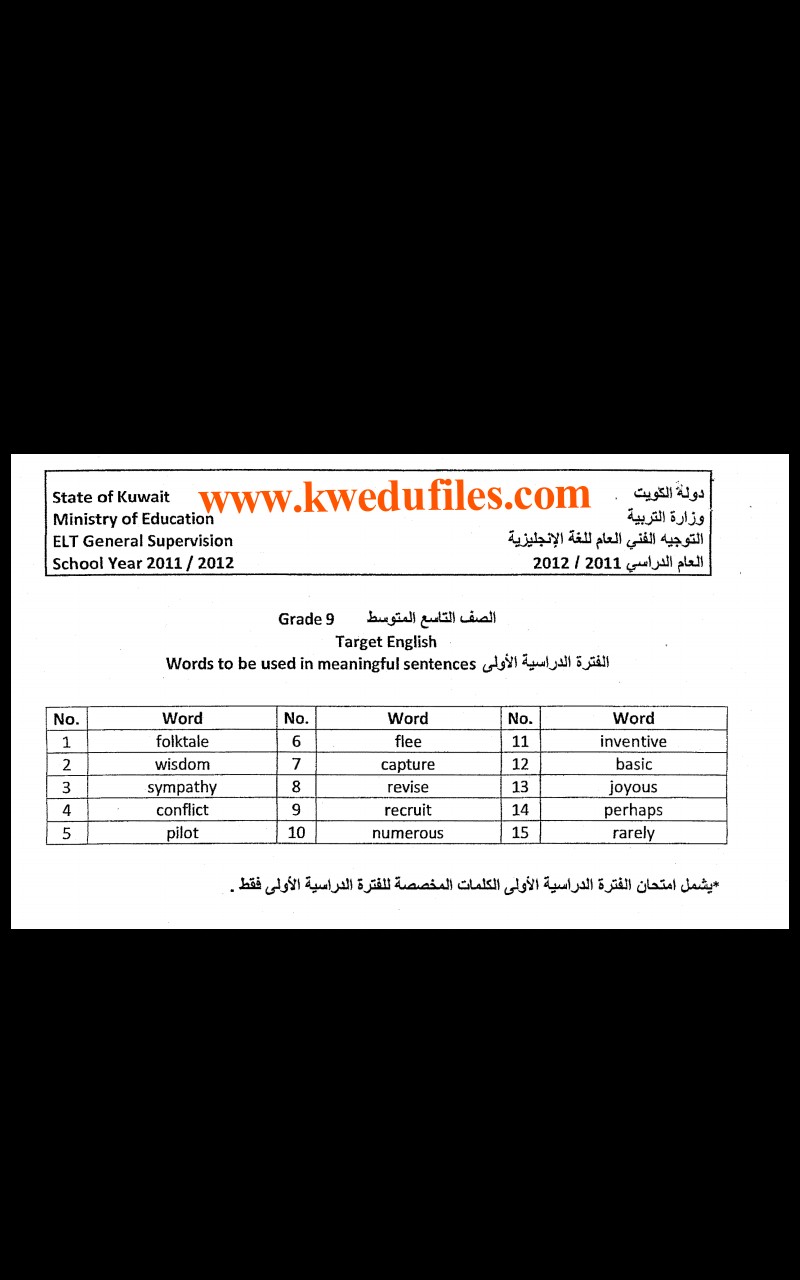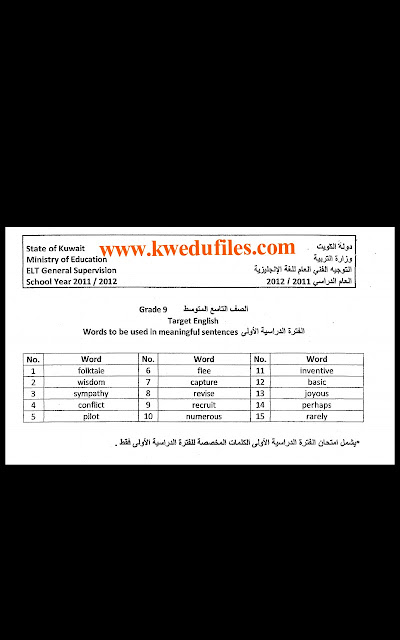 يحتوي الملف الكلمات المحددة المطلوب تكوين جمل مفيدة لغة انجليزية للفترة الاولى الصف التاسع عدد اوراق هذا الملف ورقة واحدة