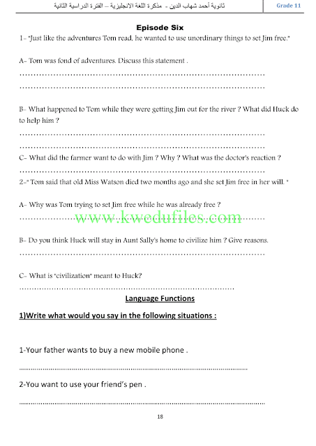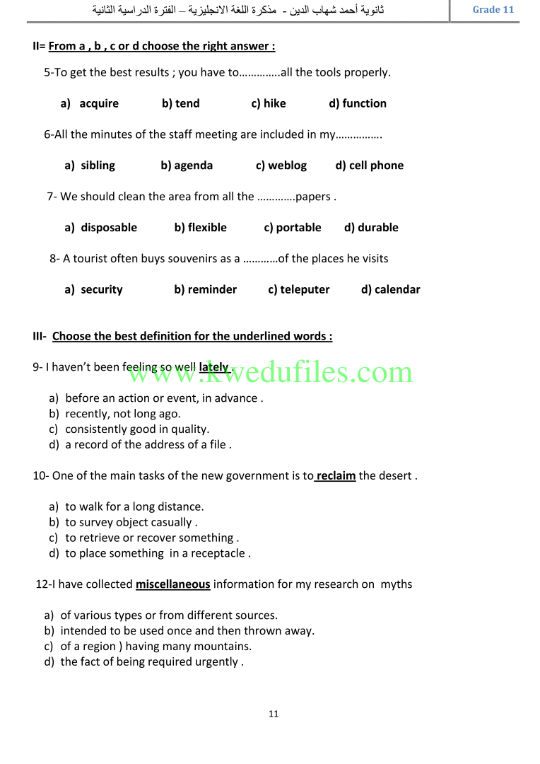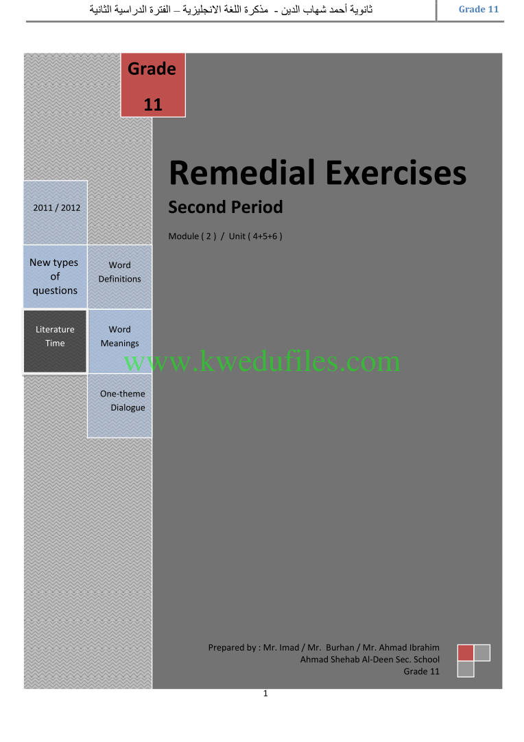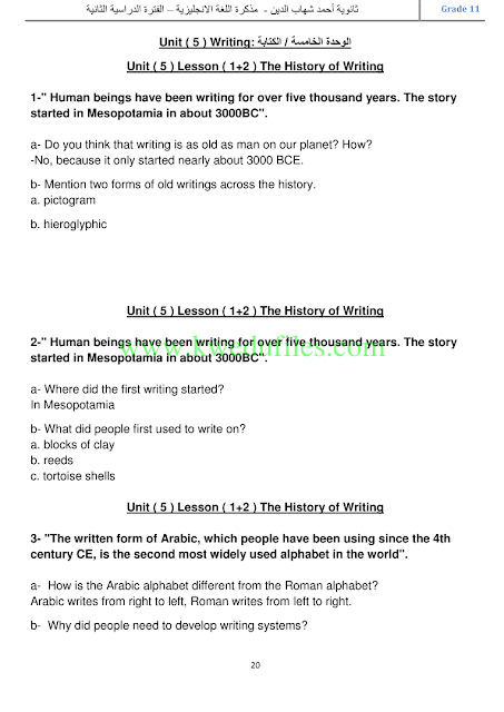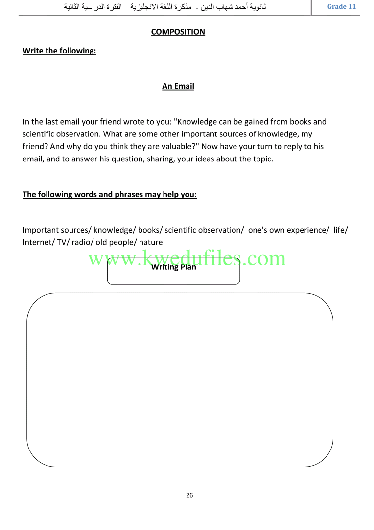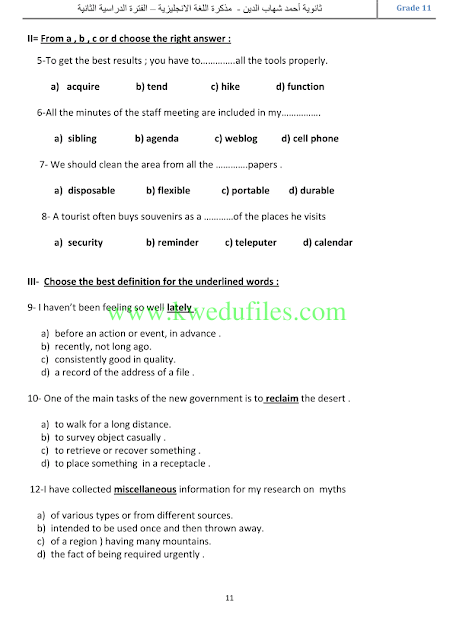 معلومات الملف: مذكرة رائعة في مادة اللغة الانكليزية للصف الحادي عشر للكورس الاول عدد اوراق هذا الملف 26ورقة | ||