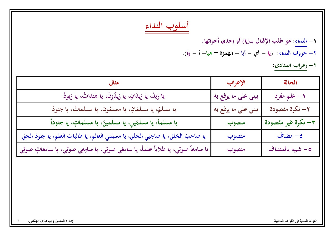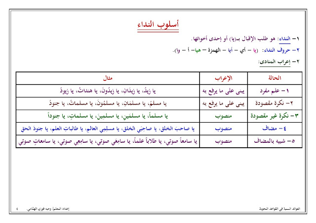 معلومات الملف: يحتوي الملف على الفوائد السنية في القواعد النحوية لمادة الللغة العربية للصف التاسع للفصل الدراسي الثاني عدد اوراق هذا الملف 8 اوراق ويتضمن اسلوب الاختصاص واسلوب التحذير والاغراء كما يتضمن اسلوب النداء وجدول لاعراب المنادى والمنادى المنصوب وكذلك انواع المنادى | ||