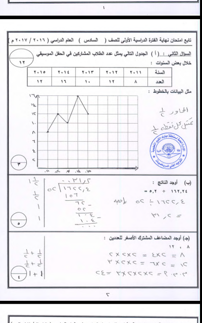 معلومات الملف: 8اوراق في مادة الرياضيات للصف السادس للكورس الاول لعام 2016_2017تتضمن نموذج اجابة اختبار تابع للادارة العامة لمنطقة مبارك الكبير التعليمية نعلمكم ان صور الملف ادناه لاتحتوى الا جزء من محتوى الملف الذي ستجده كاملا" عند تحميله | ||