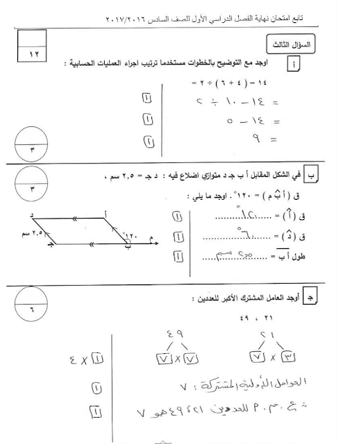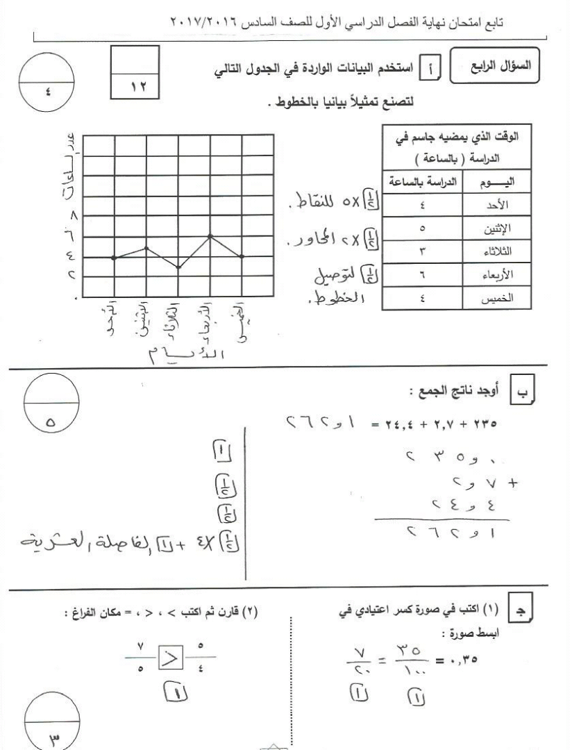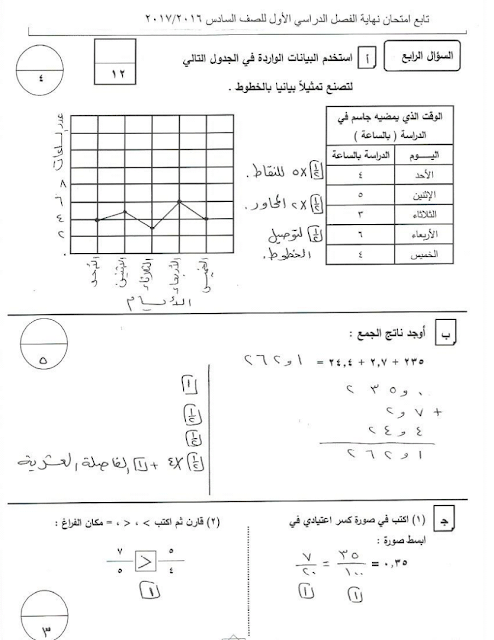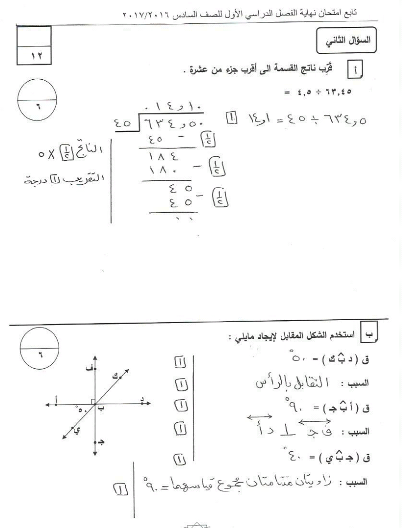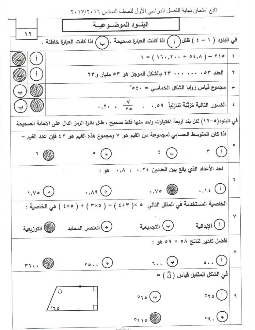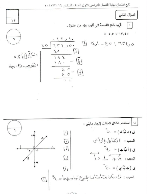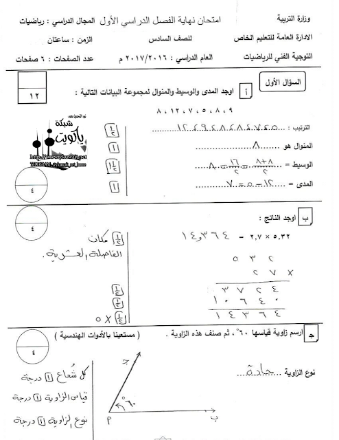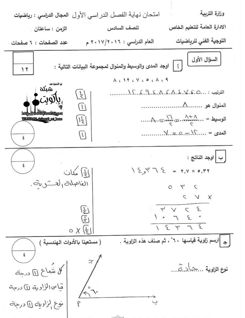 6اوراق في مادة الرياضيات للصف السادس للكورس الاول تتضمن نموذج اجابة اختبار تابع للادارة العامة للتعليم الخاص