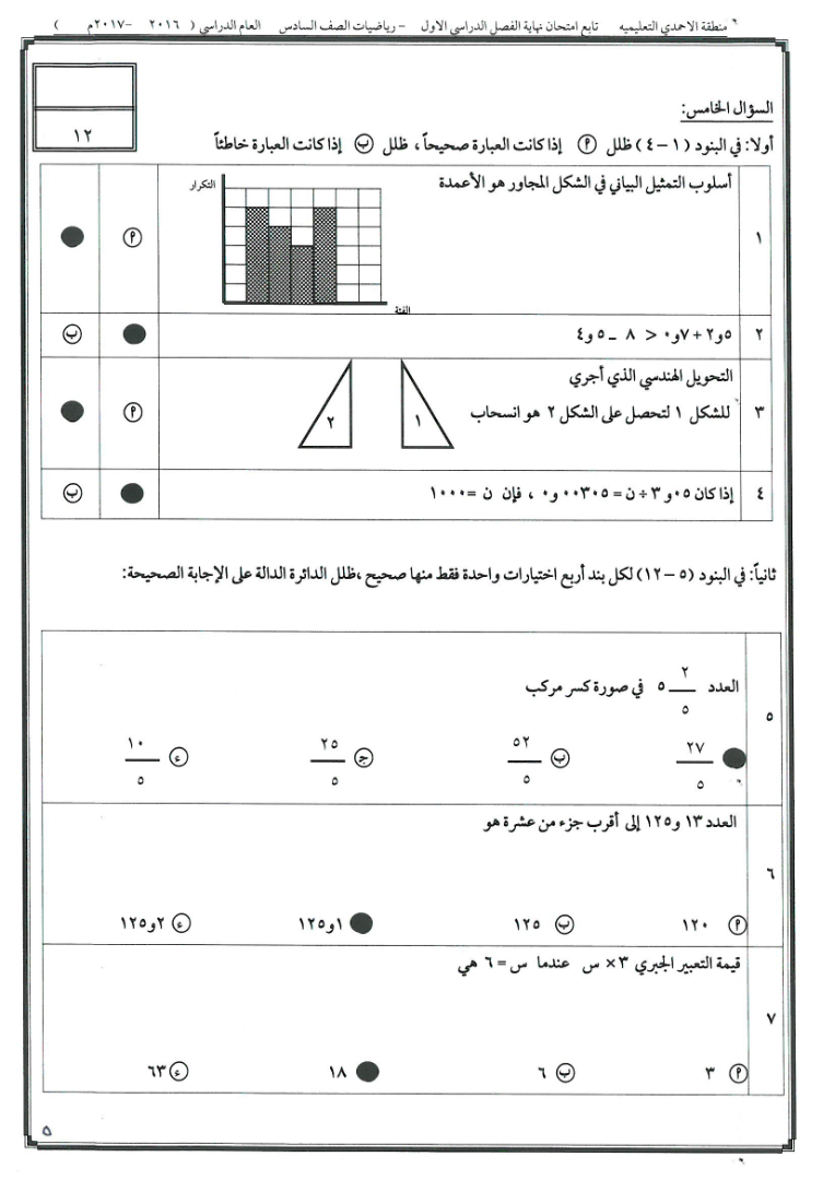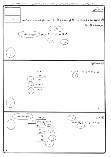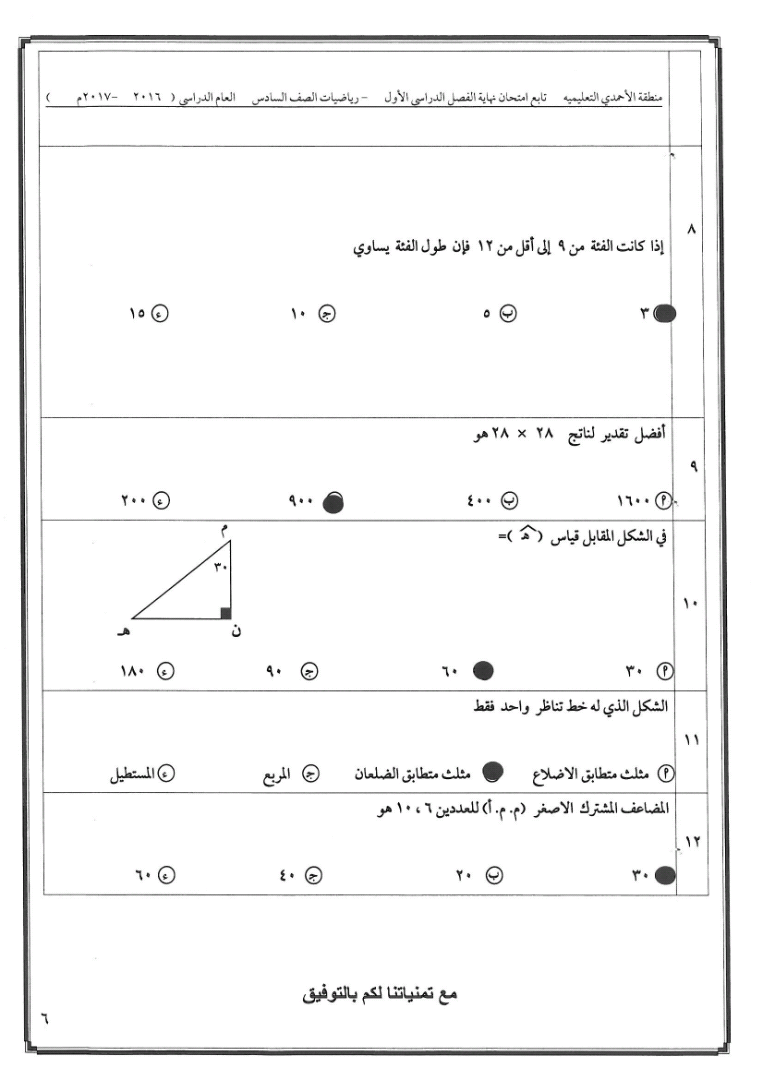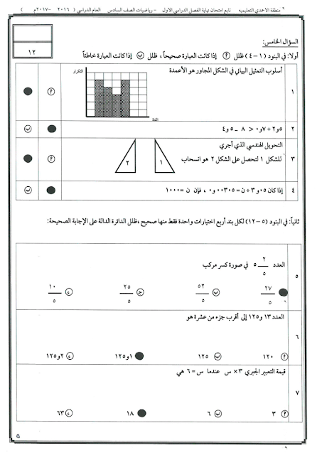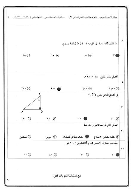 6اوراق في مادة الرياضيات للصف السادس للكورس الاول تتضمن نموذج اختبار تابع للادارة العامة لمنطقة الاحمدي التعليمية لعام 2016