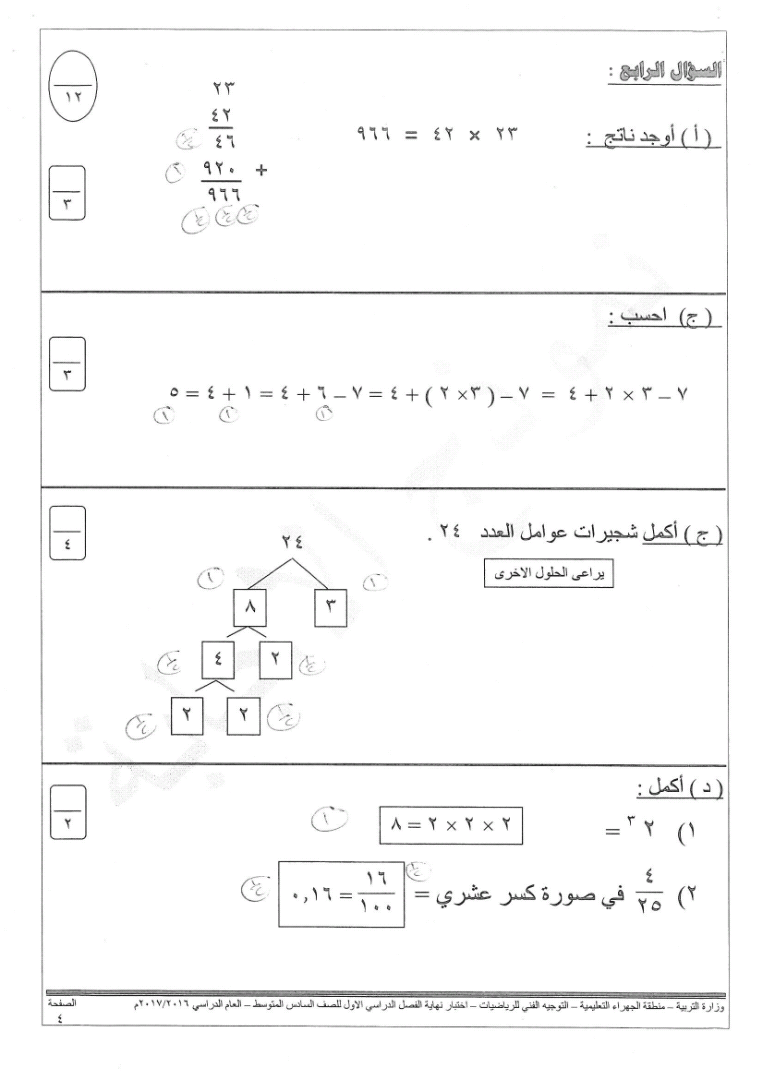 نموذج اجابة اختبار لمنطقة الجهراء لعام 2016في مادة الرياضيات - إعداد: منطقة الأحمدي التعليمية | ||