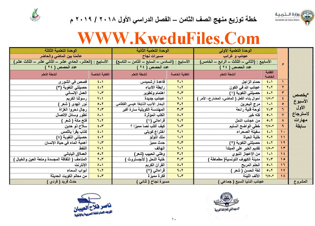 ورقة واحدة في مادة اللغة العربية للصف الثامن تتضمن خطة توزيع منهج العام الجديد 2019كورس اول
