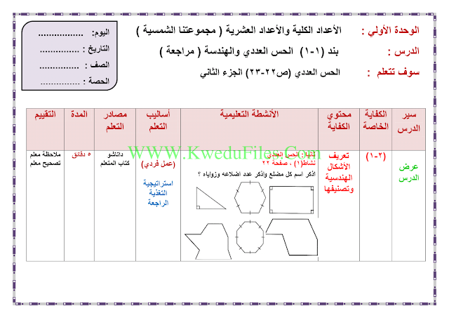 تحضير الحس العددي والهندسة للوحدة الاولى في مادة الرياضيات | ||