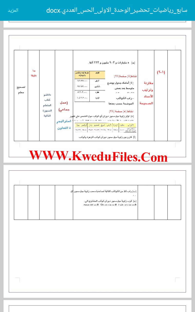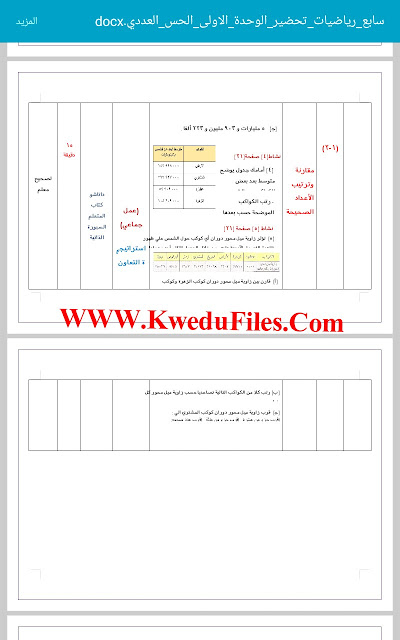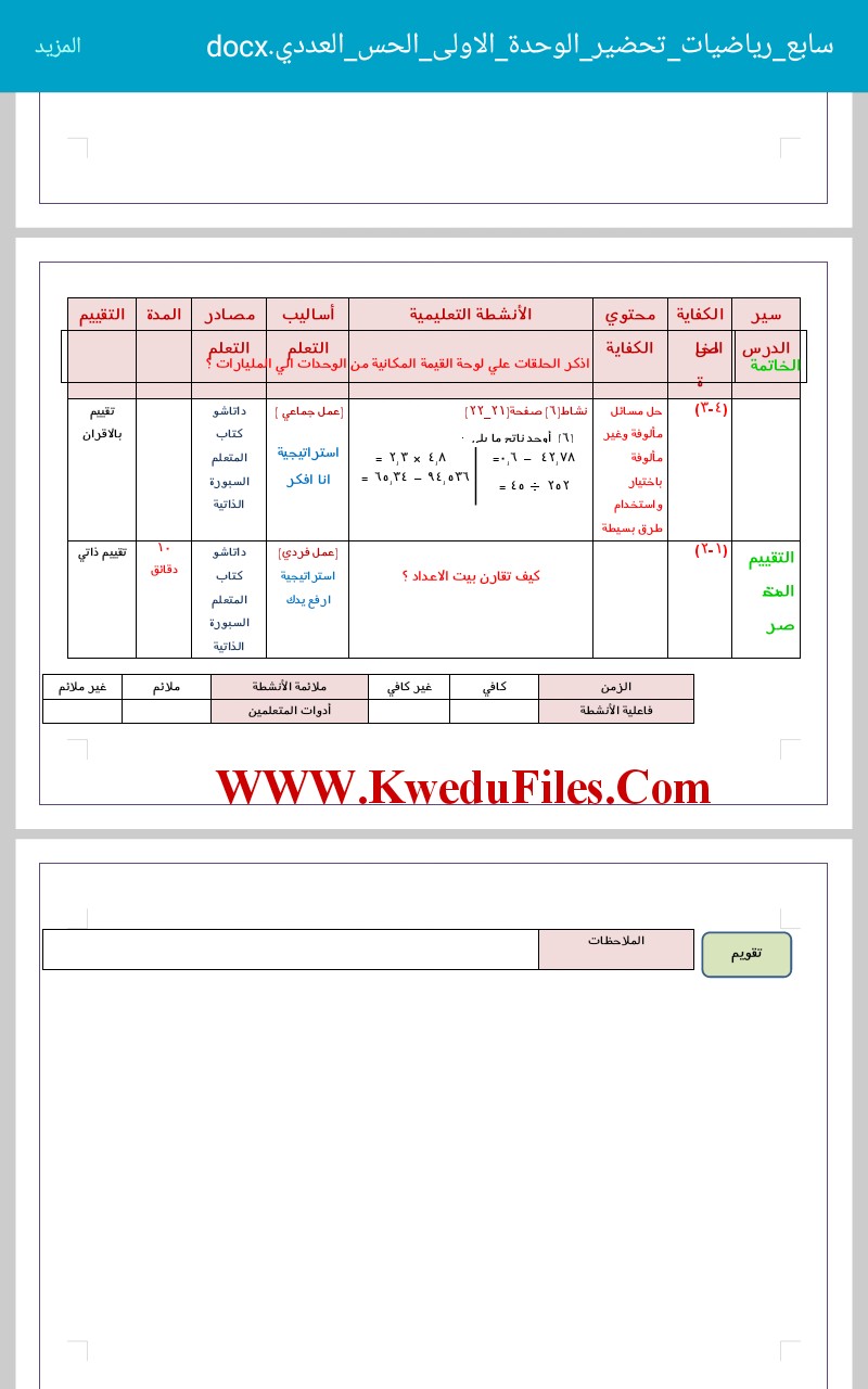 معلومات الملف: 3اوراق في مادة الرياضيات للصف السابع للكورس الاول تتضمن تحضير الوحدة الاولى اي الحس العددي والهندسة (مراجعة) | ||