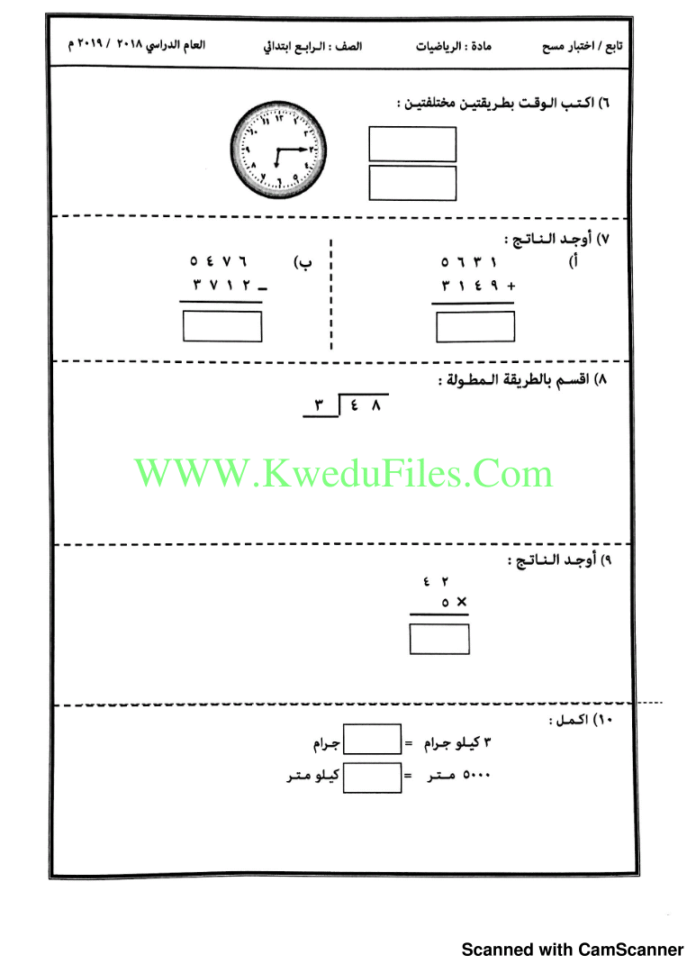 6اوراق في مادة الرياضيات للصف الرابع للكورس الاول تتضمن نموذج اختبار مسح لعام 2018_2019