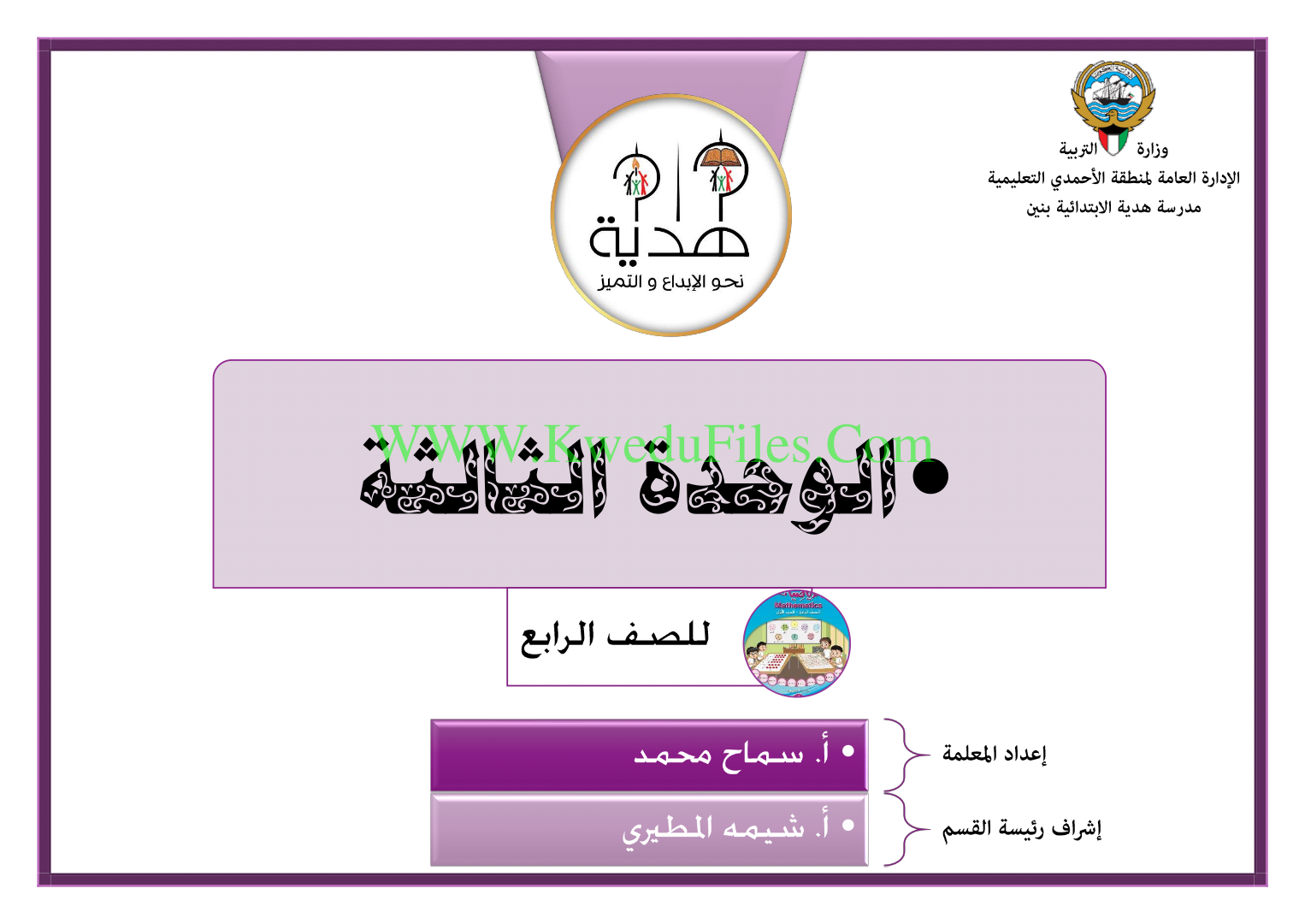 معلومات الملف: الوحدة الثالثة في مادة الرياضيات للصف الرابع للكورس الاول عدد اوراق هذا الملف 70ورقة مع العلم ان صور الملف ادناه لاتحتوي الا على جزء بسيط من محتوى الملف الذي ستجده كاملا" عند تحميله