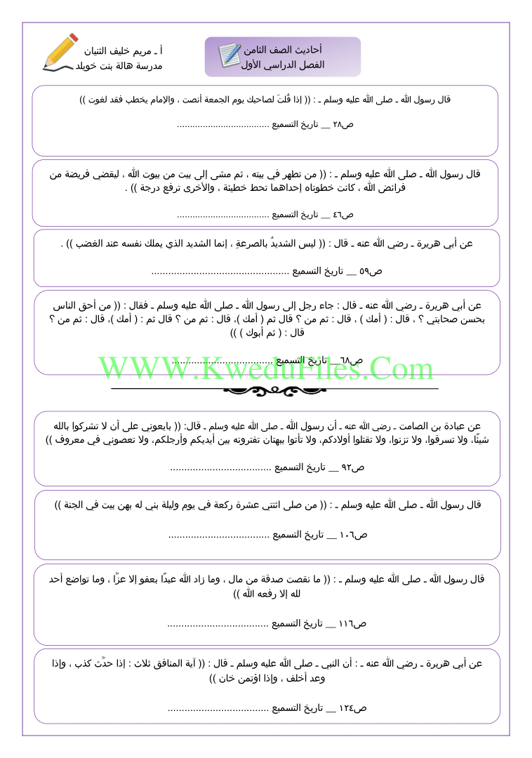 معلومات الملف: ورقة واحدة في مادة التربية الاسلامية للصف الثامن للكورس الاول تتضمن الاحاديث المقررة حفظها لعام2019 | ||