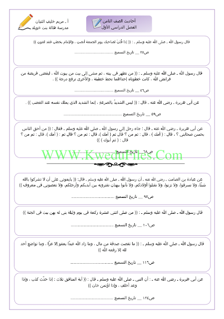 الاحاديث المقررة حفظها في مادة التربية الاسلامية لعام | ||